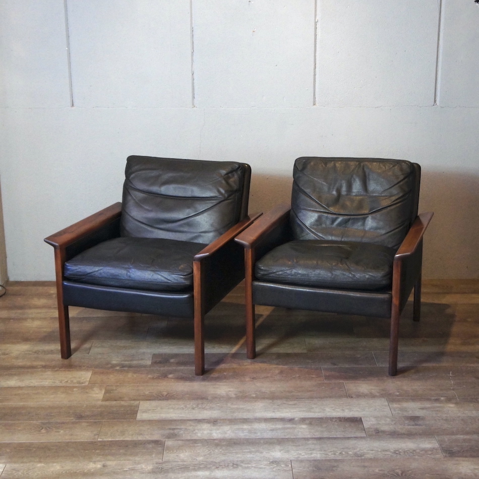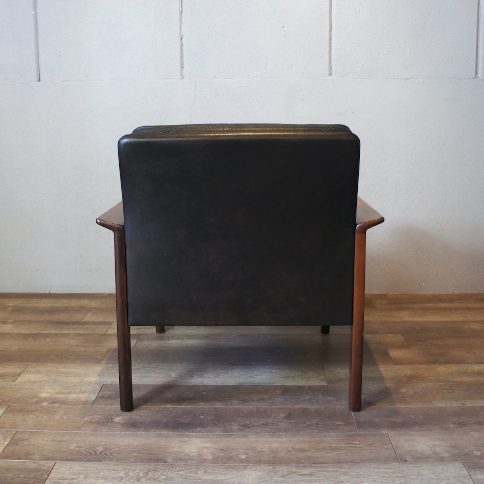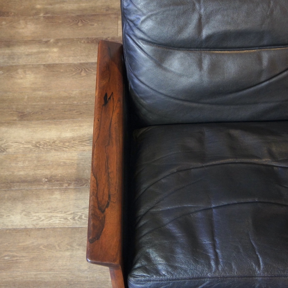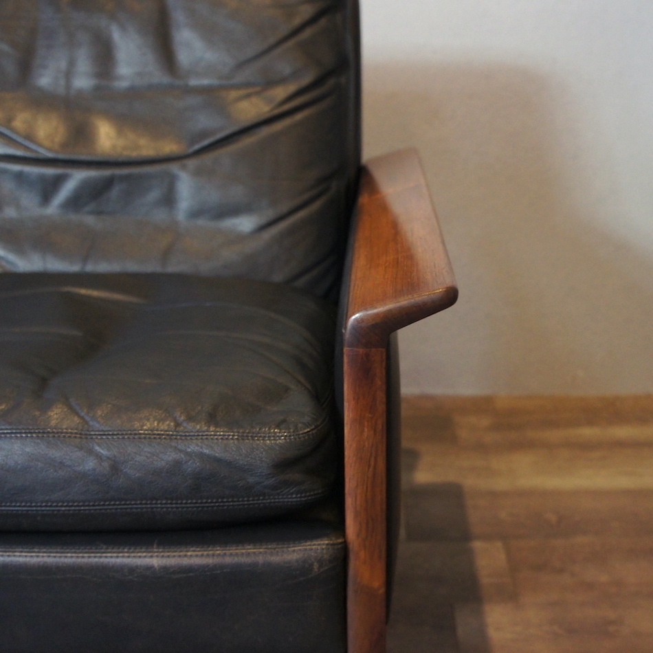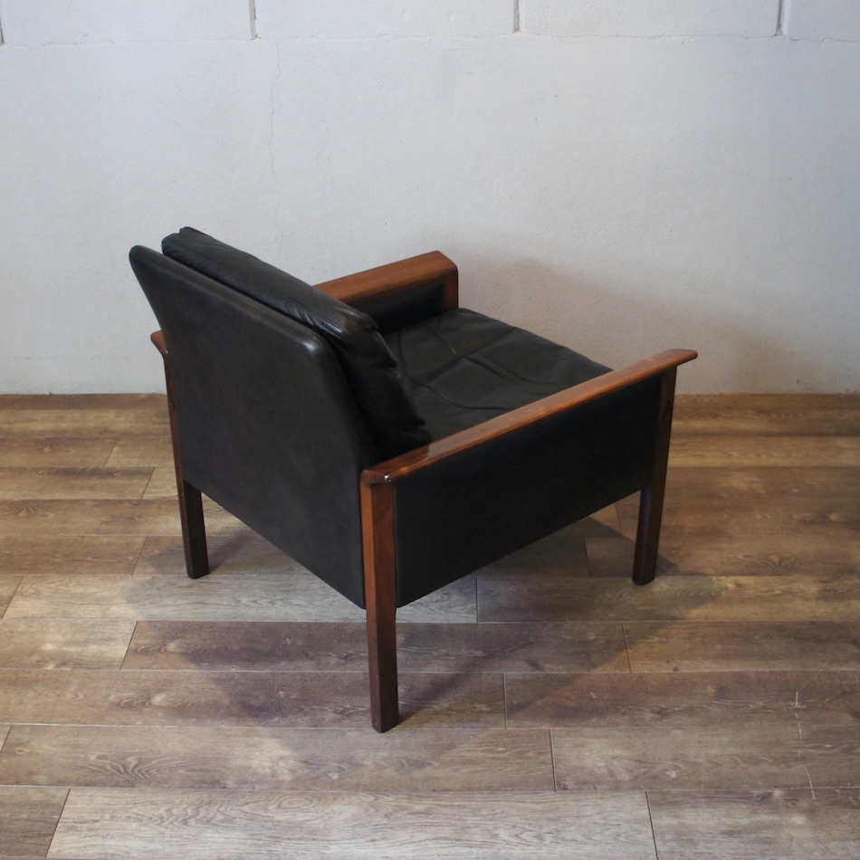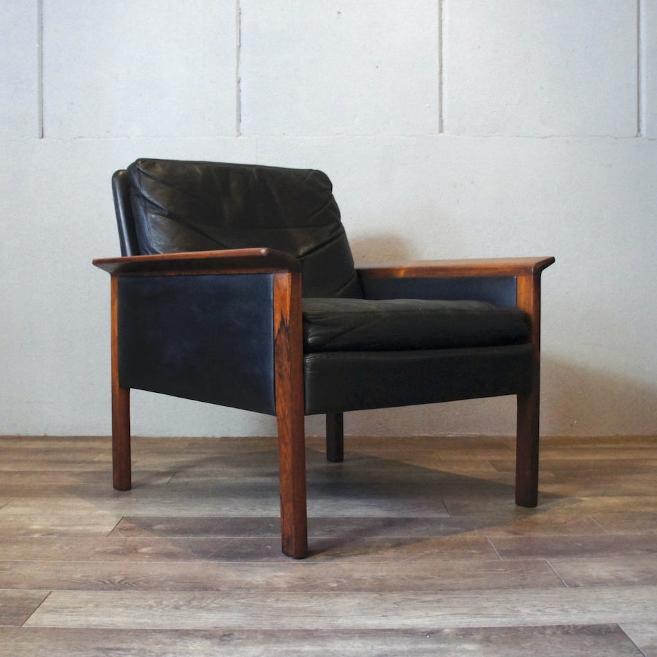 ローズウッドのフレームに張地は本革、クッションインナーは羽毛。せり出したアームと前後のレッグが繋がる直線基調のサイドヴュー、ローポジションの背と座を黒レザーが引き締める精悍なデザイン。ハンス・オルセンのスタンダードと言える完成されたフォルムのシングルソファです。