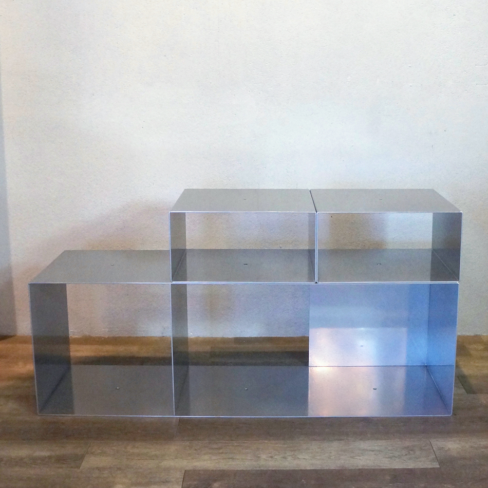 スチール素材を折り曲げて造られたフレームは、厚みが僅か4mmながら高強度を実現。薄いフレームと背板を配さない部分も多いため、クールなメタリックグレーカラーでも重い印象にならず非常にシャープ。コネクタービスで上下のユニット、ベースとユニットを簡単に固定できます。ベースを使用せず自由な積み重ねももちろん可能。