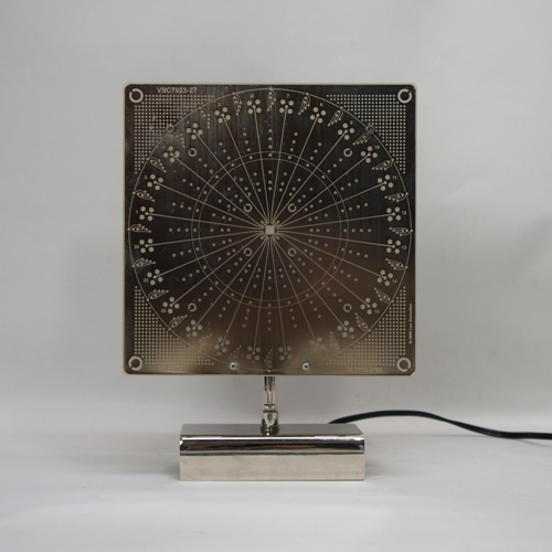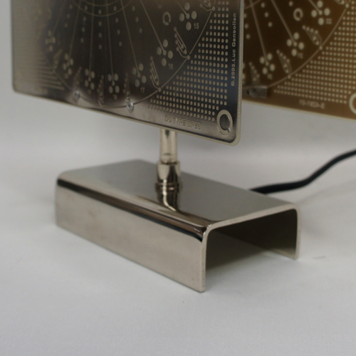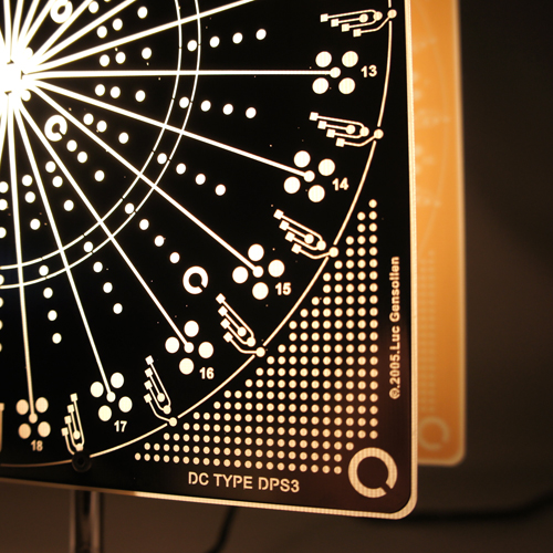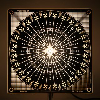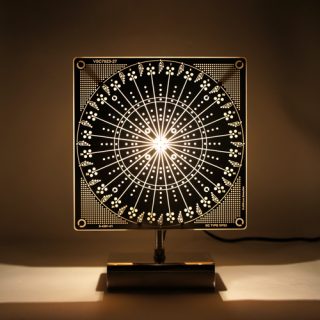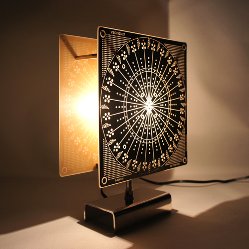本アイテムは照明の為にオリジナルデザインでプリント基板を制作。中心から放射状に伸びる細密な直線と円、それを取り囲むドットで構成されたサークルデザインは、デジタル空間に描かれた陰と陽の「曼荼羅」。ハイテクなマテリアルでありながらプリミティブな印象も併せ持つスピリチュアルアートにも感じられます。