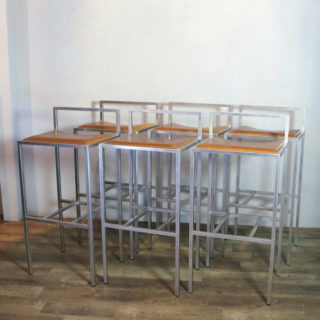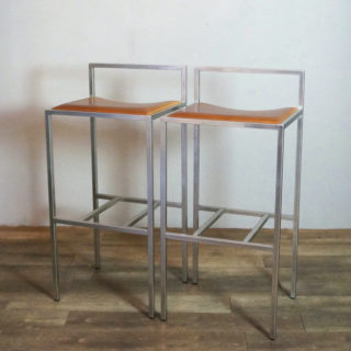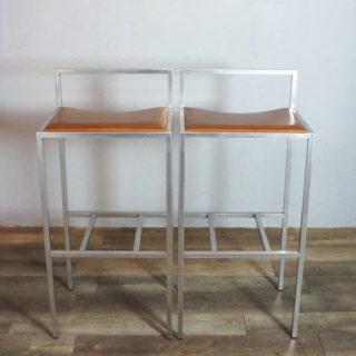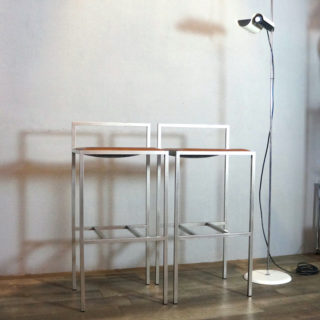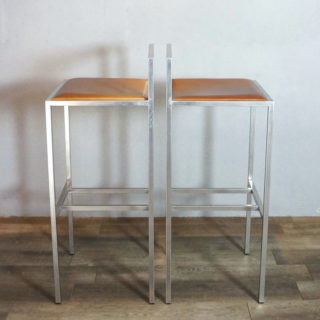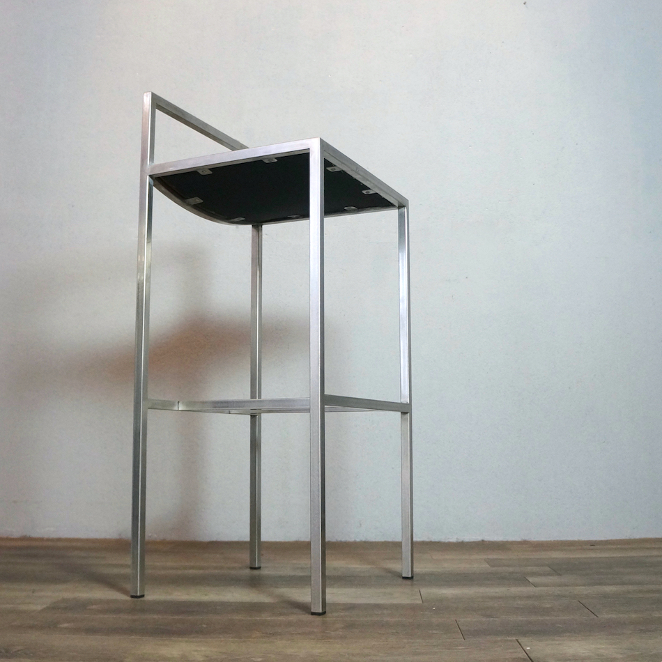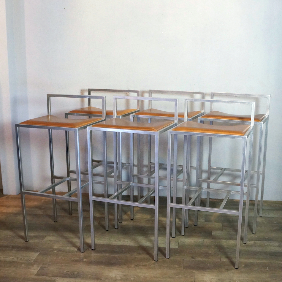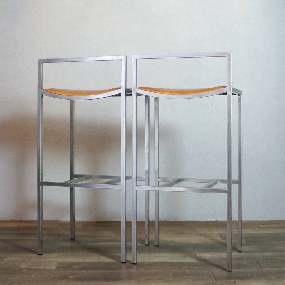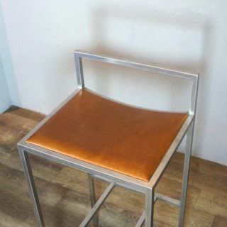 ステンレスパイプをスクエアフォルムに組み上げ、シート部はヌメ革張り。ステンレスのフレーム溶接部は細部まで非常に丁寧に仕上げられ、また、表面を「バイブレーション」と呼ばれる不規則に細密な傷が模様のように入る研磨加工が加えられており、とても手間のかかった上質な仕様で製造されています。