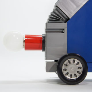 元の扇型の本体の一部を活かし、全体造形、カラーリング、電気回路と電装品、車輪の増設などあらゆる部分を加工改修。ゴジラ細胞からメカゴジラが誕生したように、メカで武装した21世紀版の”Mechanized Super Lamp”を製作しました。
