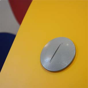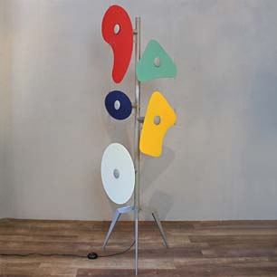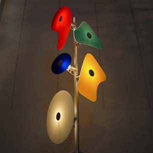 直立するシャフトを囲む5色のガラスプレートそれぞれに光源をセッティング。彫刻作品のような三次元フォルムに明かりを灯すと、カラフルな抽象造形が【orbital】の名の通り空間に光の軌跡を描いて浮遊する芸術的プロダクト。