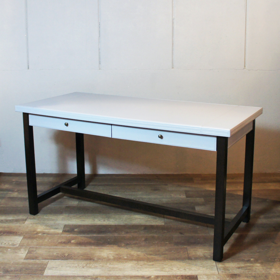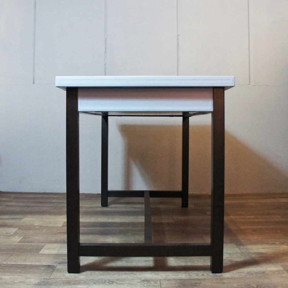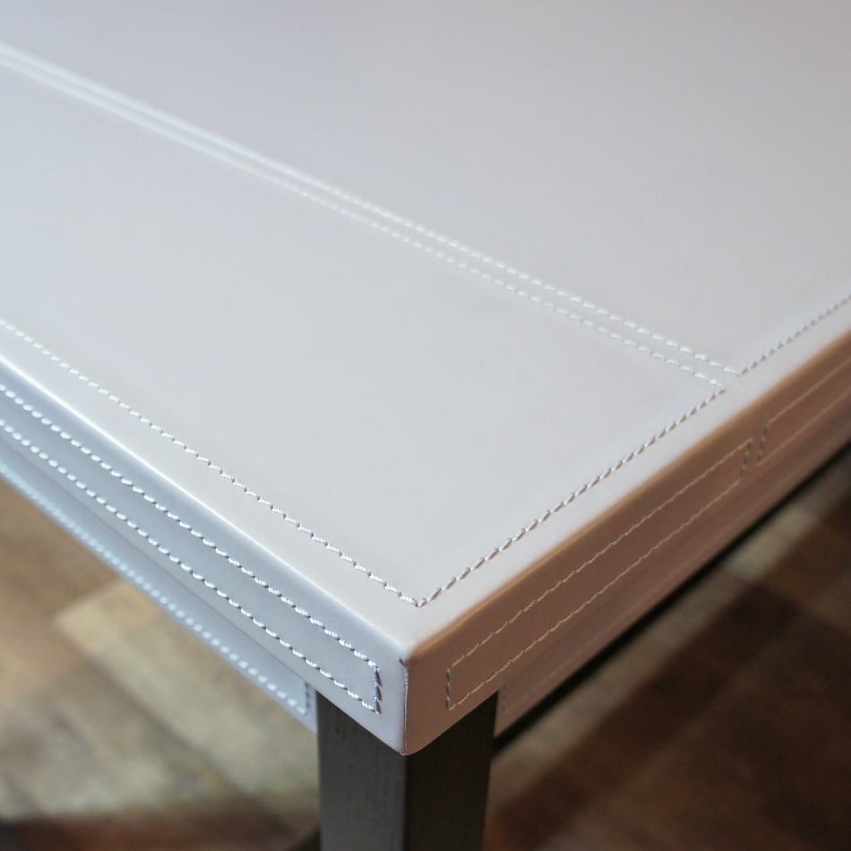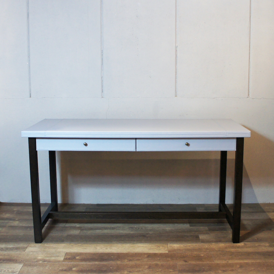 上質なオイル仕上げの鞣し革張りの天板に、オーク材の脚部。ブルーグレーとブラックの洗練されたツートンカラーに、シンプルで直線的なデザイン。レザーに施したホワイトステッチがアクセントとなり、全体の印象をを見事なまでにエレガントに仕立てたコンテンポラリーなイタリアンモダンデザイン。