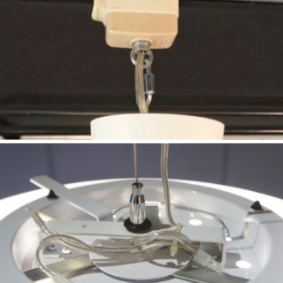 アイテムは同シリーズのシーリングランプに伸縮式ワイヤー、電源コード、引っ掛けシーリングを取付け、ペンダントタイプにアレンジ加工した照明です。