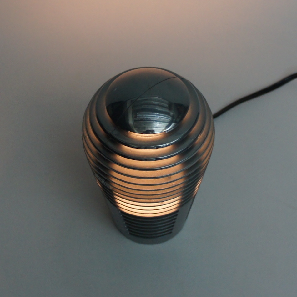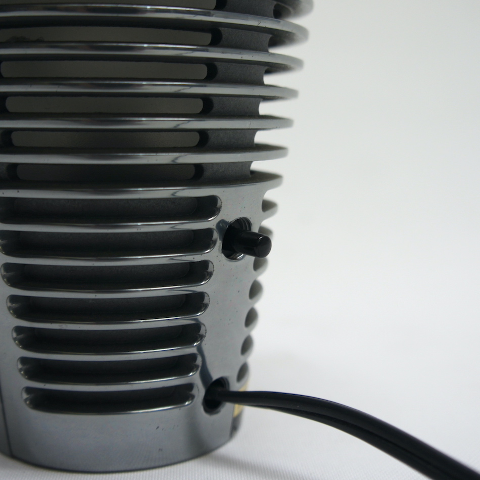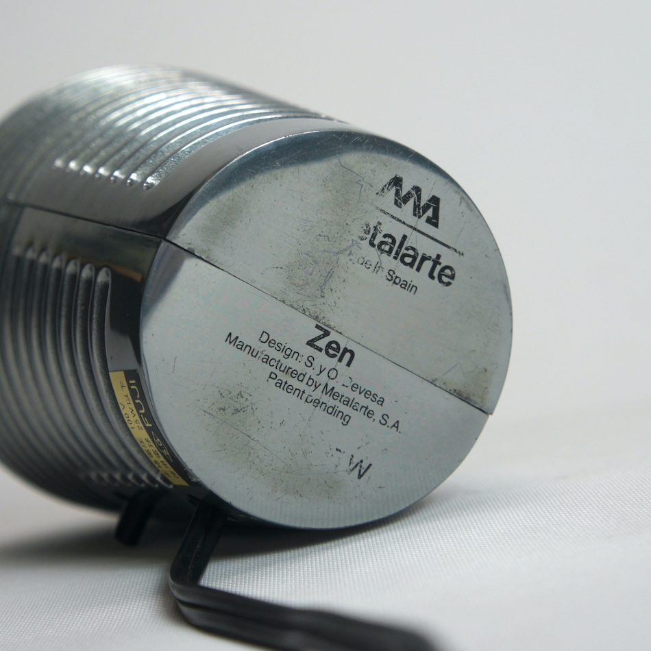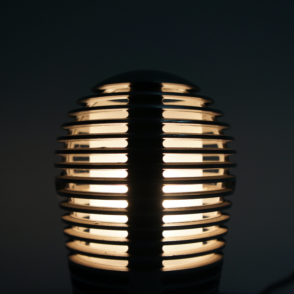 スリットの入ったキャストアルミニウムのカバーパーツ2枚を合わせた空冷エンジンのシリンダーヘッドのようなメカニカルなフォルムですが、日本語の「Zen = 禅」と名付けている事から和の伝統的照明「行灯」や「提灯」をイメージしてデザインされたものと考えられます。