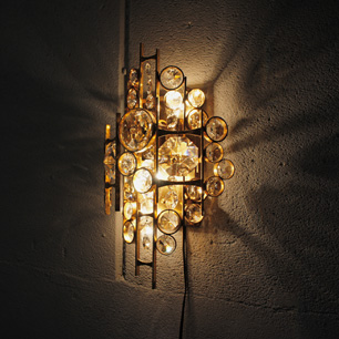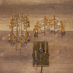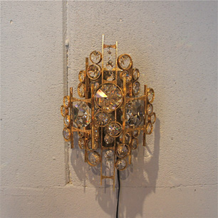 モダンスカルプチャーのようなゴールドブラスのフレームに、美しいカットクリスタルドロップ。ブラケットには電球3灯が光の拡散を計算して段違いに配置され、輝く彫刻が室内壁面にに眩い陰影を創り出す、非常にアート色の強いヴィンテージ照明です。