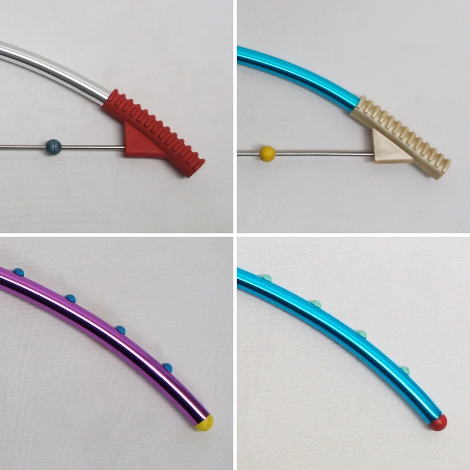 ギリシャ語でアルミを意味する”アルミニオ”と名付けられたこのハンガーのシリーズは、アルミニウムシャフトにアルマイト塗装、ラバーや樹脂のパーツで装飾を施した複数のデザインとカラーのバリエーションが存在しました。<br>