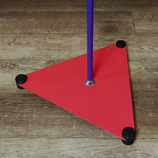 氏のアイコンとも言えるゴム製の丸いアクセントパーツが付いたスチールの三角形のベースから伸びるシャフトに、曲線を活かしたアルミダイキャスト製の照明ヘッドをセット。
