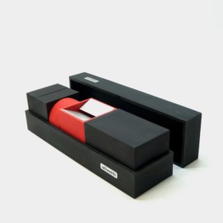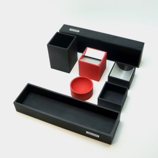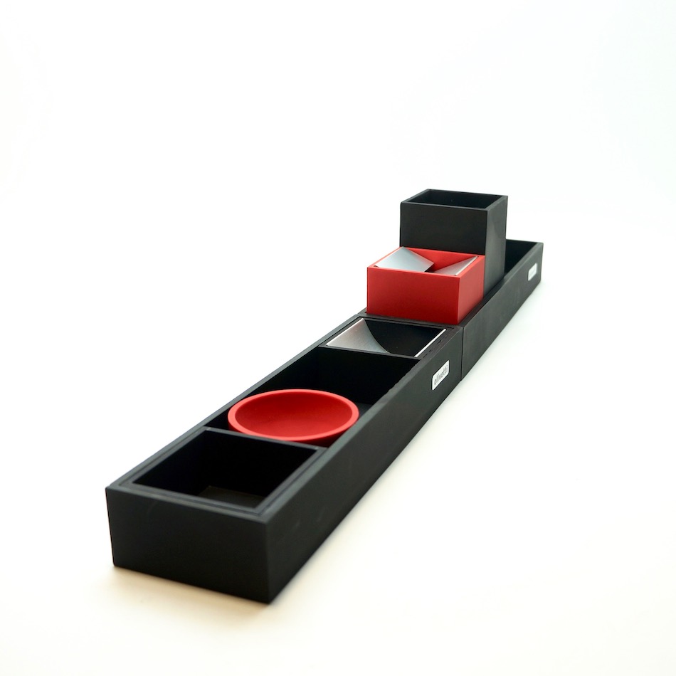セットにはアッシュトレーの「cubo」の他、特製のエレメント(ペンスタンド、アシュトレー、クリップトレー、ラウンドトレー、スクエアトレー)が全部で5点、これらがピッタリと収まる上下2つの”Olivetti”の銘板付ケースに収納されます。