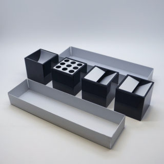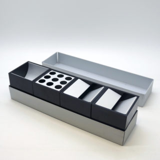 セットには、 ペンシルホルダー&ペーパークリップホルダーとアッシュトレーが2個が全部で4点、これらがピッタリ入る上下2つのアルミニウムケースに収納されます。