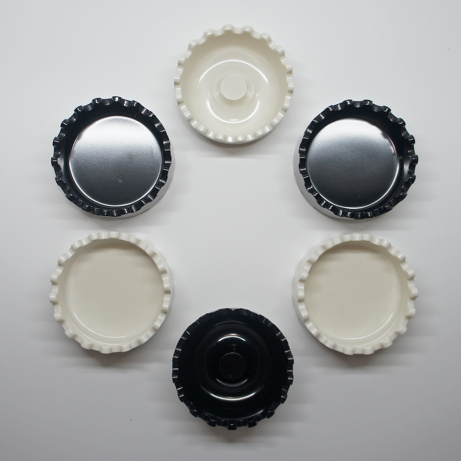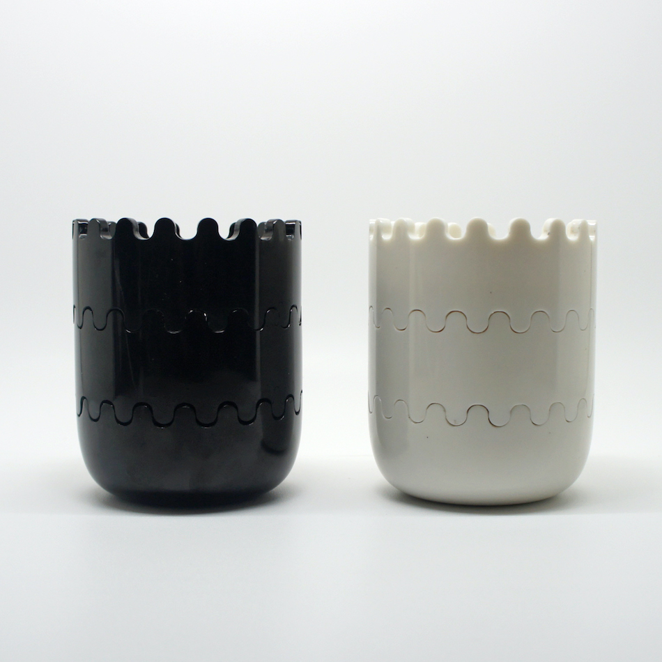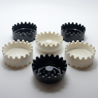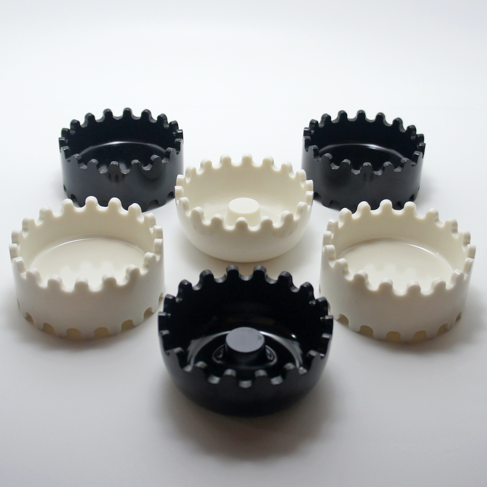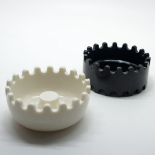 「ジェミニ」には様々なカラーバリエーションがあり、本品は白と黒それぞれ3個のツートンカラーSet。計6個からなるフェノール樹脂製の灰皿は丈夫で破損しにくく、上下噛み合うようにスタックする構造によって収納性に優れ、空気が遮断され煙草の火が自然に消える機能を持たせています。