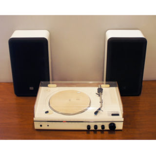 FM/AMチューナー&レコードプレーヤーを一体化したレシーバーアンプと左右のスピーカーを統一デザインでまとめた卓上オーディオセット。