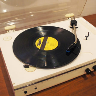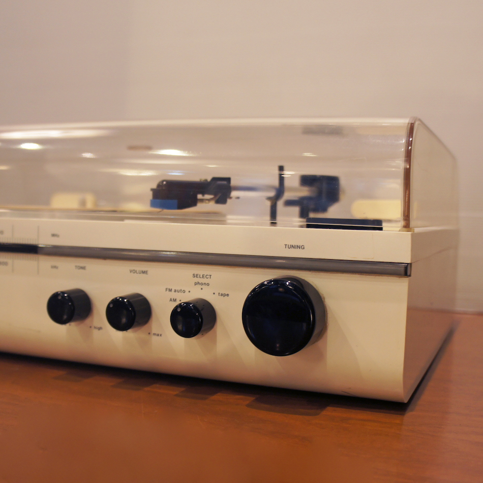 レコード再生(45&33rpm オートリターン・オートカット機能)、AM/FM Stereoチューナー、外部入力可。*片側スピーカーのメーカーエンブレム欠品