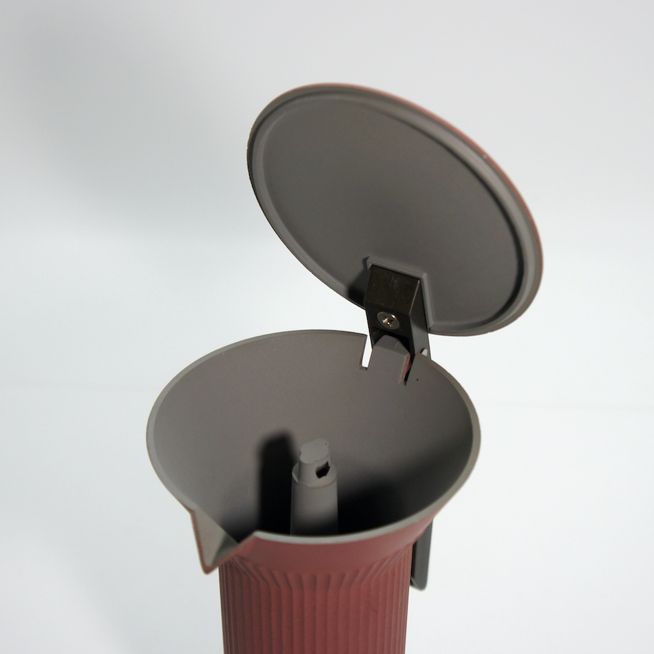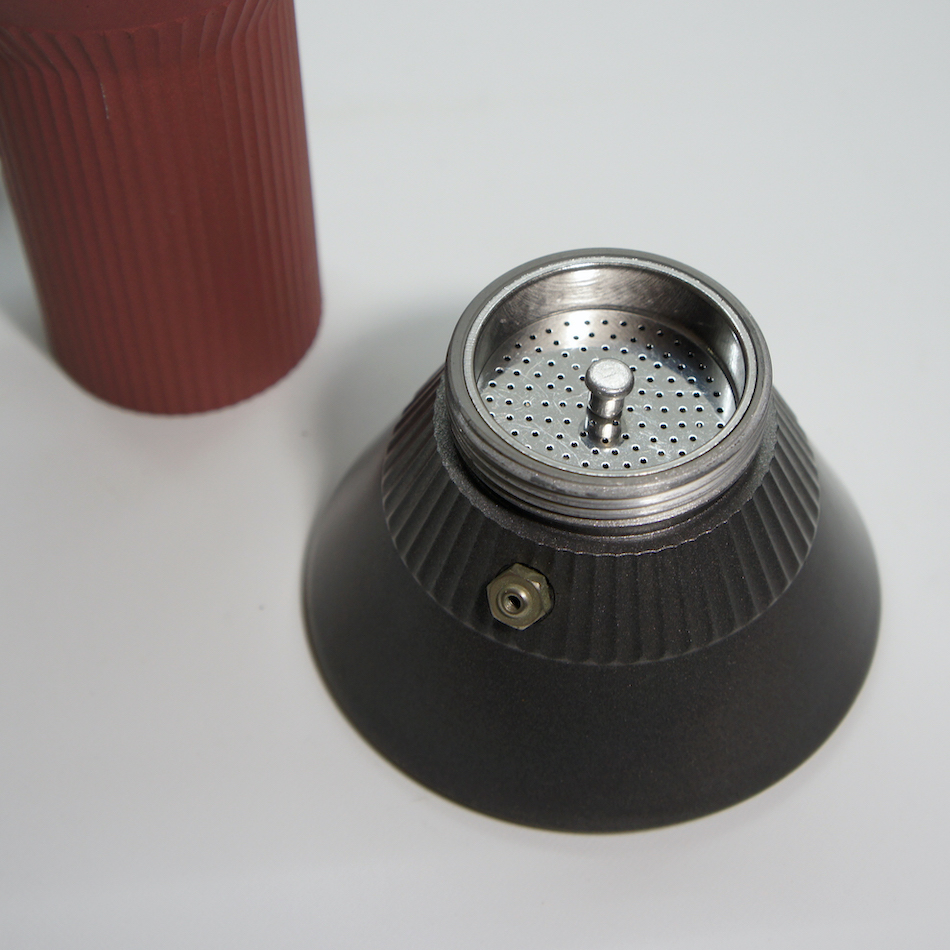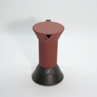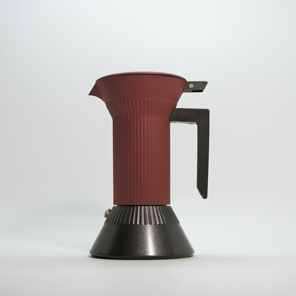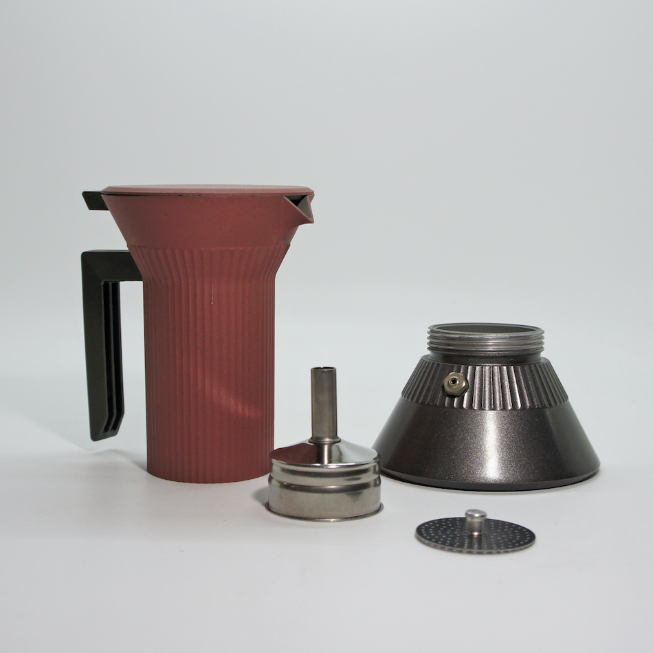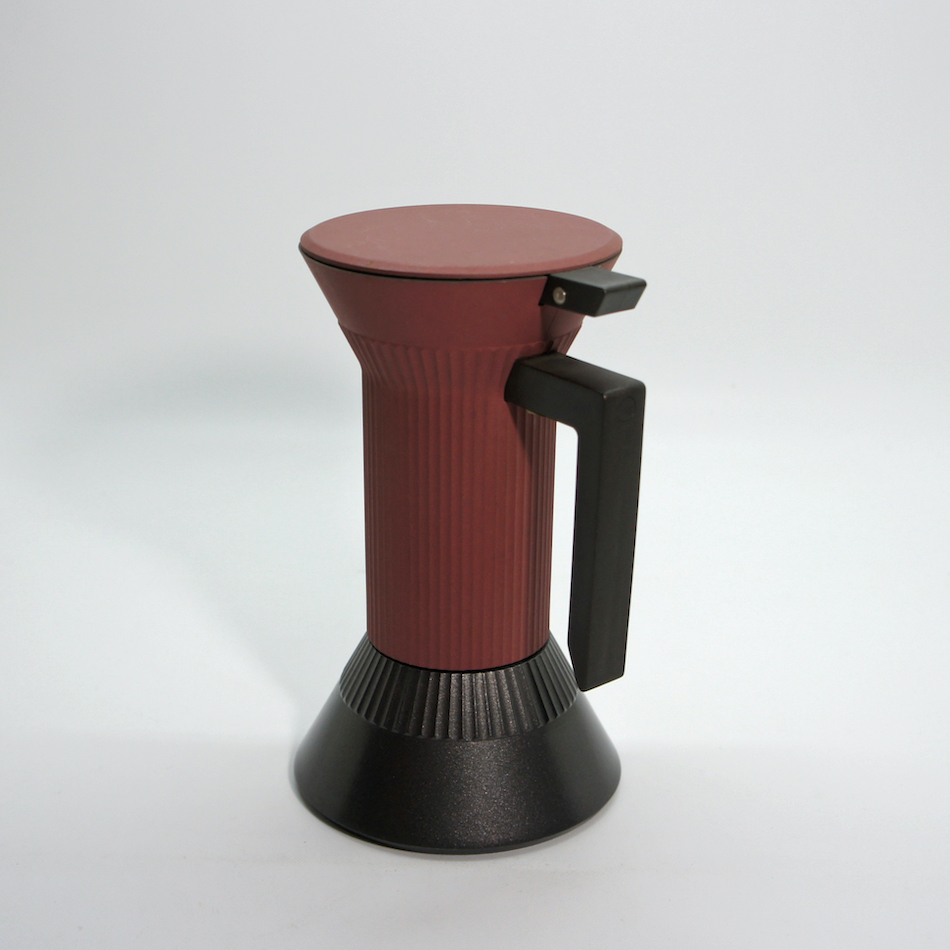 上下一対の円錐をギリシャ神殿の柱のようなシャフトでつないだ特徴的フォルム。下部の水が火にかけられて上部でコーヒーに変わるという一連のプロセスを、ある種の「儀式的」な現象として捉え、機能とイメージを両立させたコンセプチャルなデザイン。