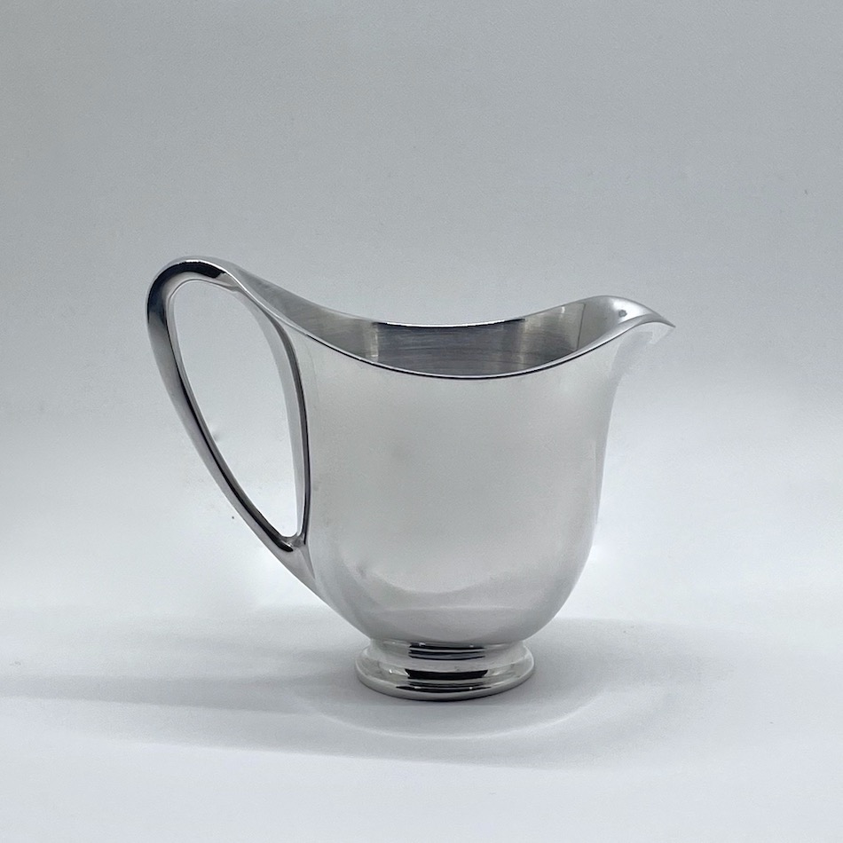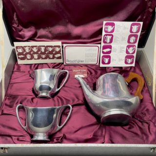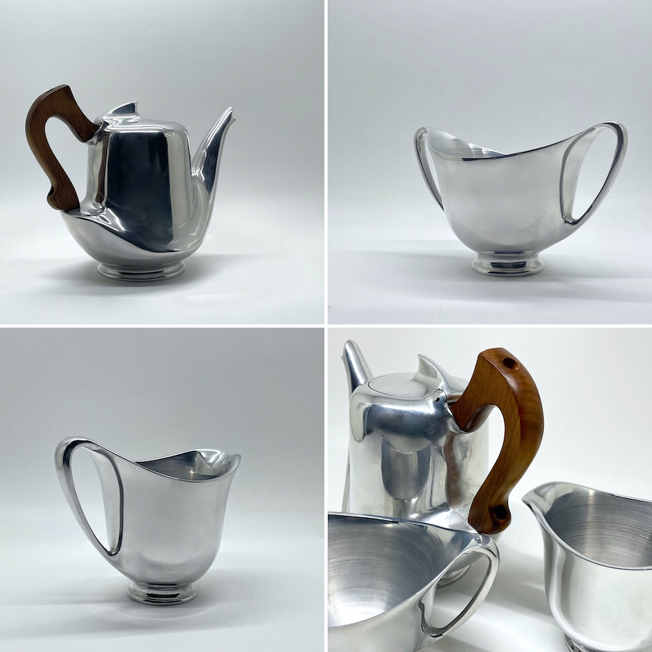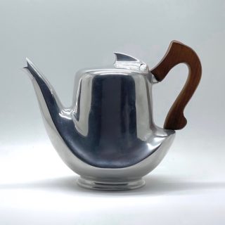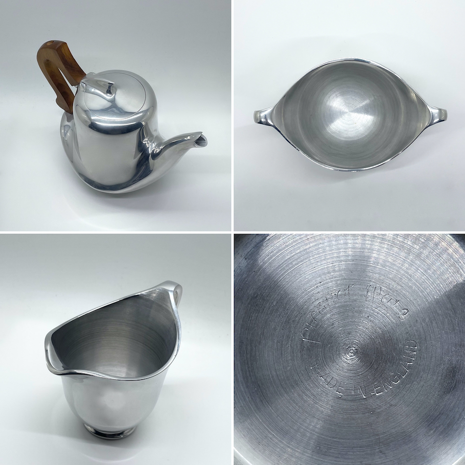 アルミにマグネシウムを加え、銀のような輝きを持ちながら曇りにくい製品を実現し爆発的なヒットをもたらした”ピコーウェア”、伝統のクラフトと工業技術の融合がもたらしたアール・デコ的流麗なデザイン、シンプル且つ木の温かみも持った英国らしいモダンでエレガントなプロダクトです。