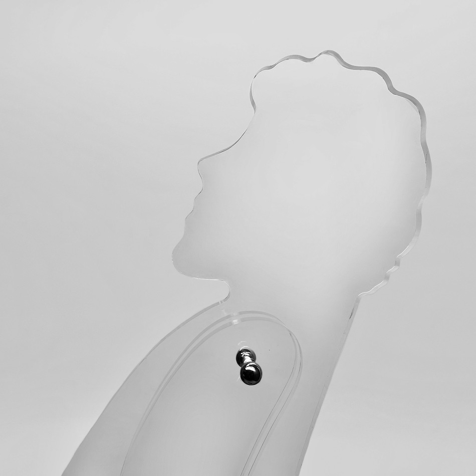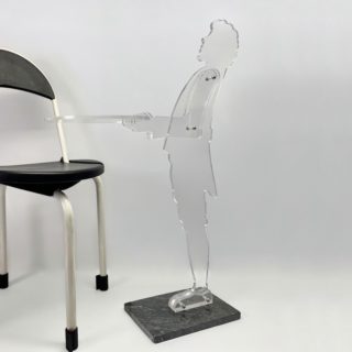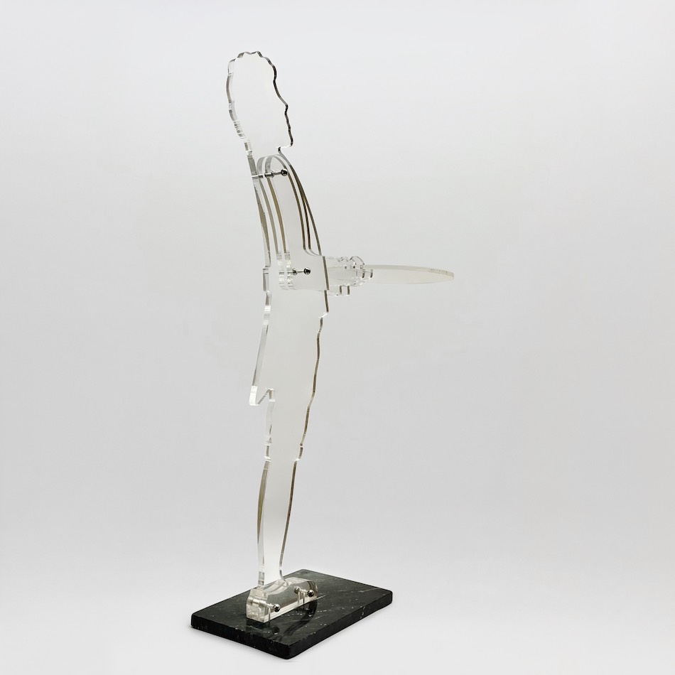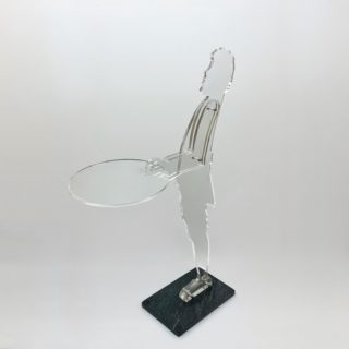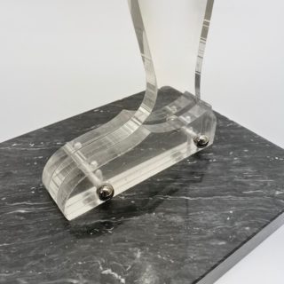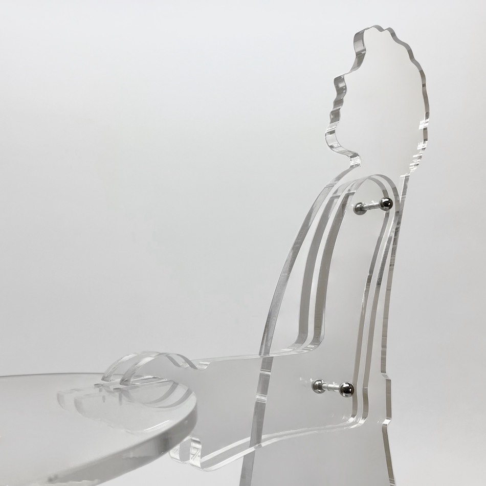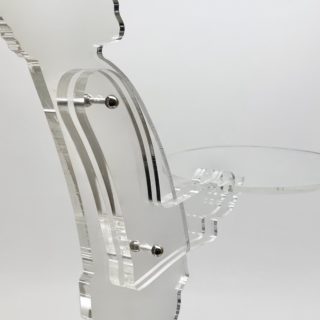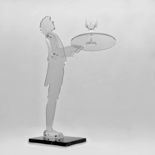 ボディー、アーム、トレーなどの形状にカットした厚いクリアルーサイトのフラットプレートを重ねたバトラーフォルムをベースの黒大理石に据えてスタイリッシュにアップデート。