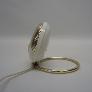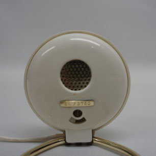 卓上でもハンドマイクとしても使える2WAY仕様。当時、日本の家電メーカーも影響を受けたと思われる形状や色使いで、経年変化により程よいアイボリーに変色したケースと、ゴールドメタリックの組み合わせが初見にもかかわらず懐かしさを覚えます。