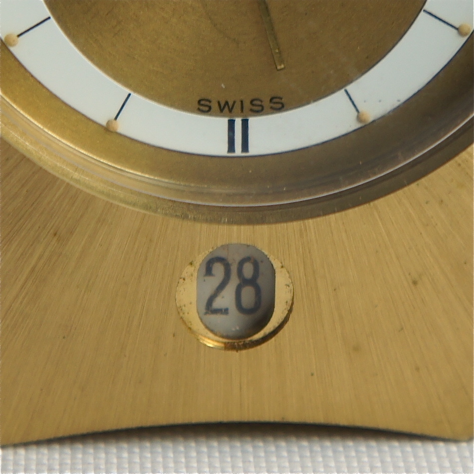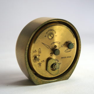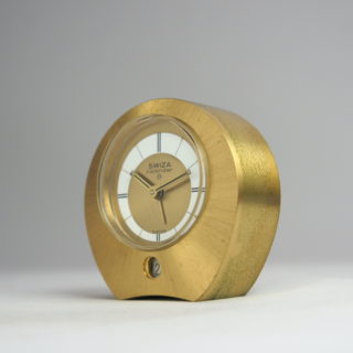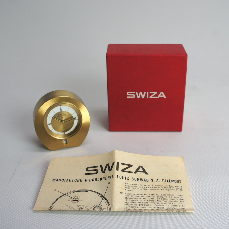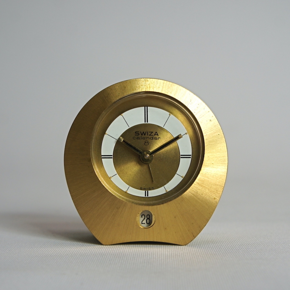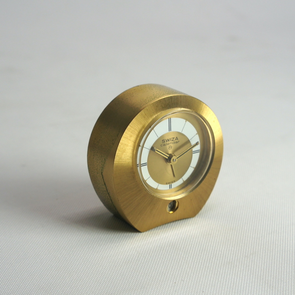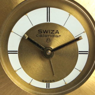 スイスの高級真鍮置時計における最大のメーカーであった”SWIZA” が、1950年代に発表した8日巻き機械式ムーブメントにアラームと日付表示機能を持たせた手のひらサイズの置き時計です。