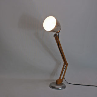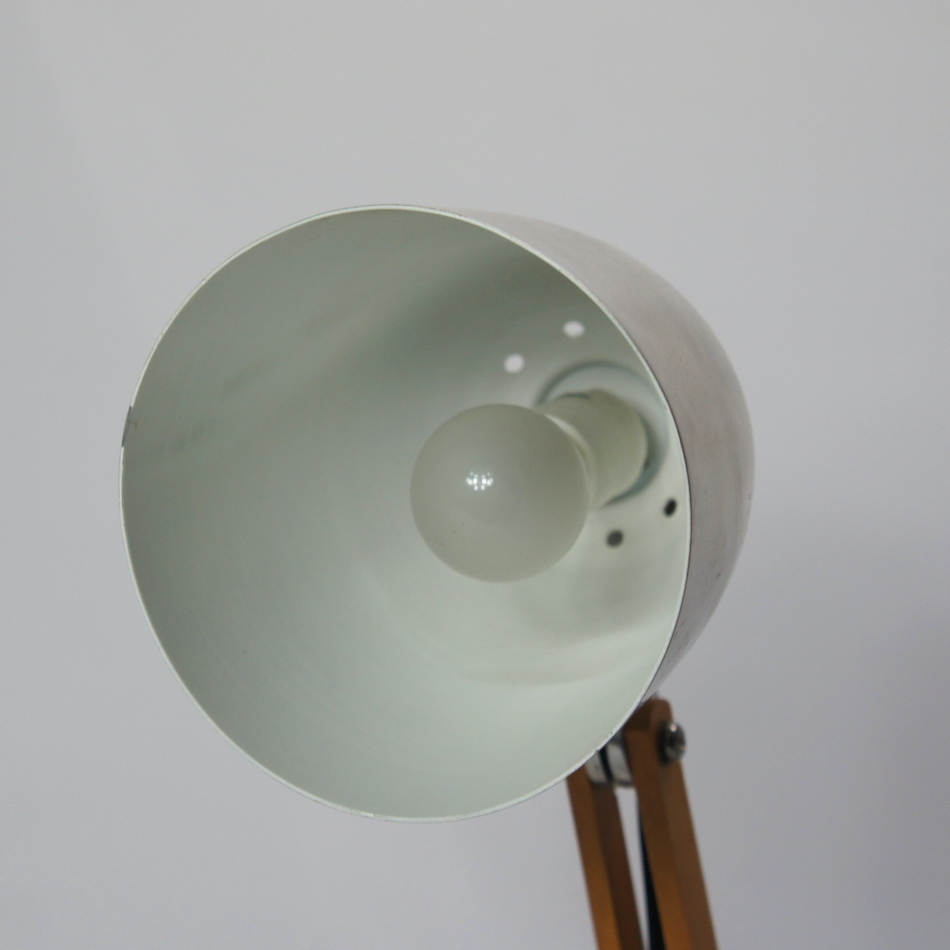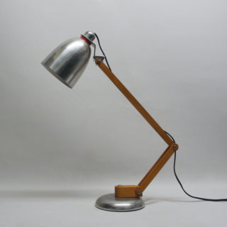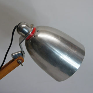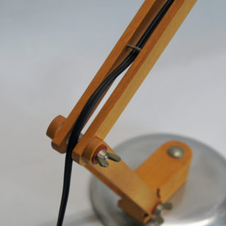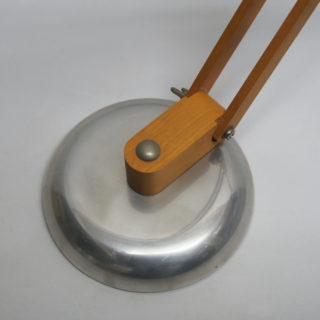 アルミ製のシェードと台座が木製アームで連結され、ジョイント部3箇所で角度の調整が可能。