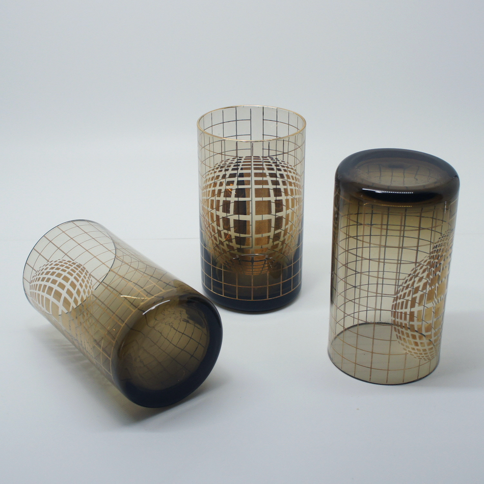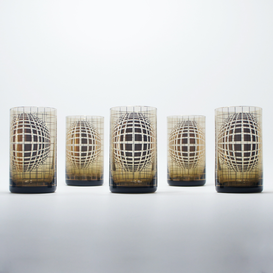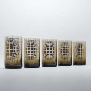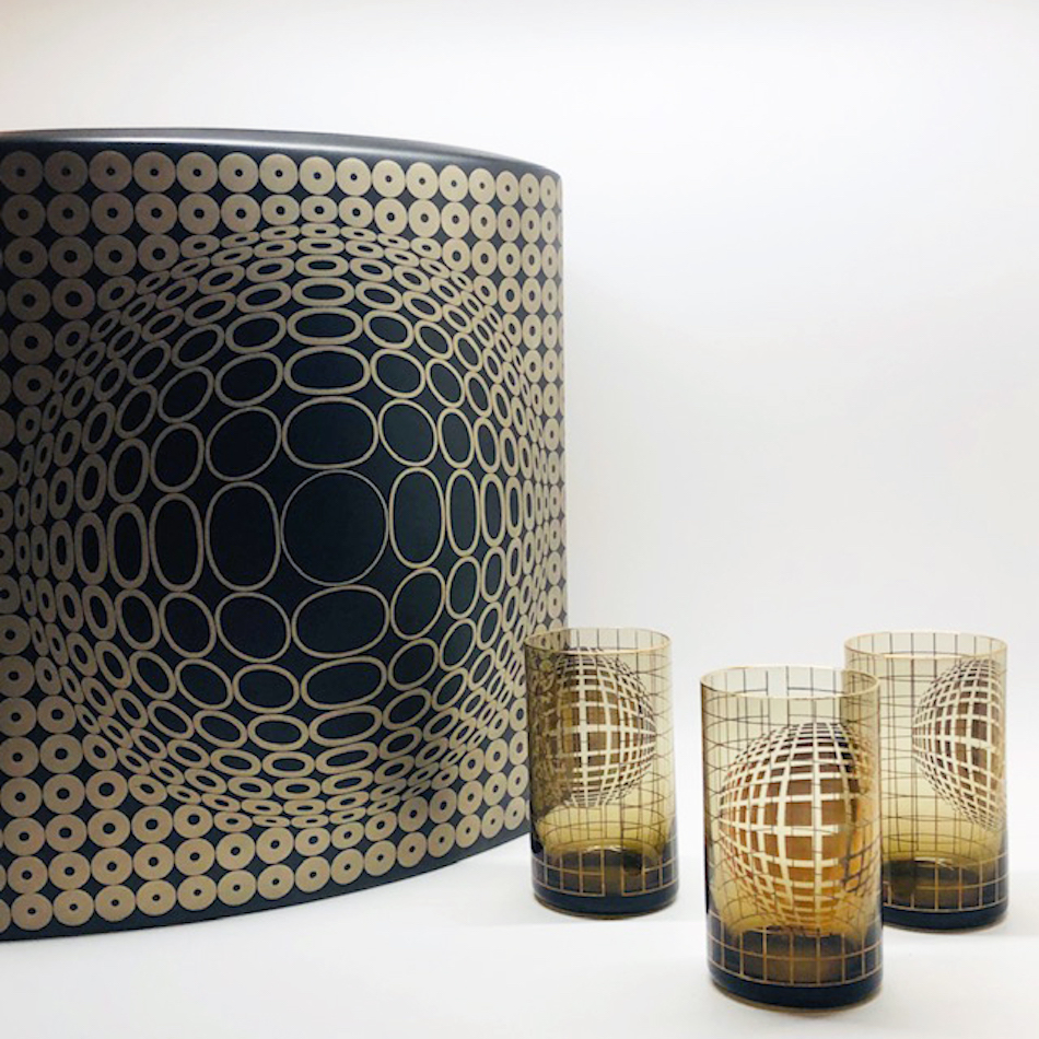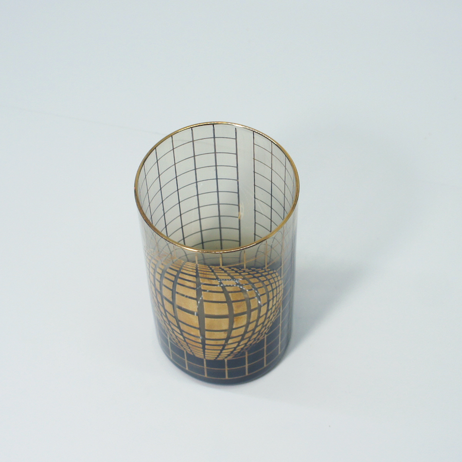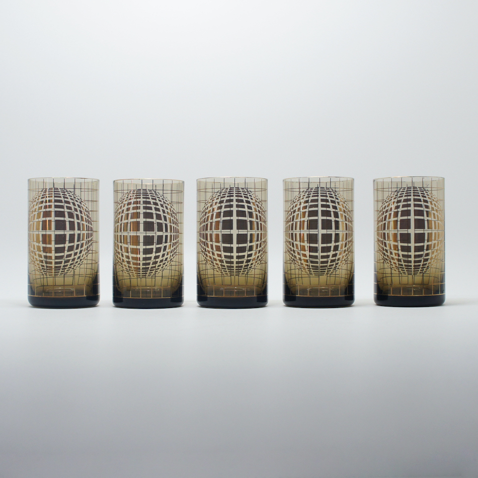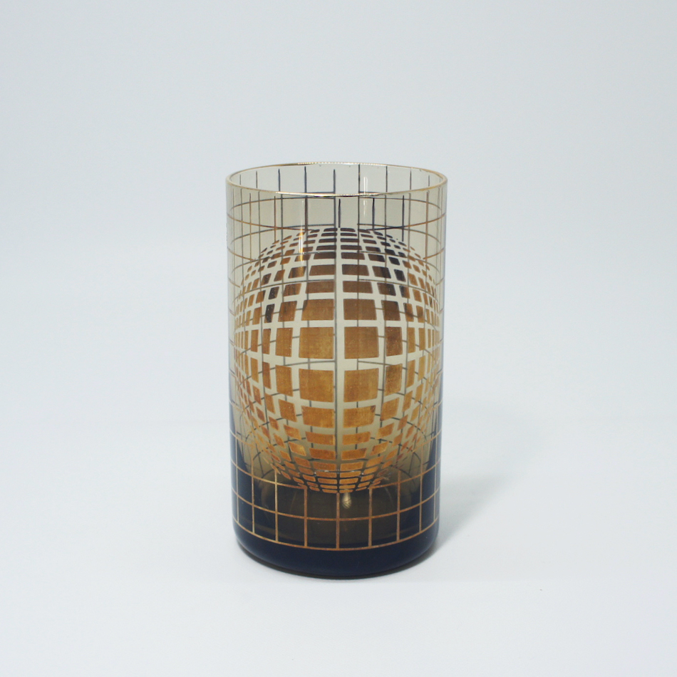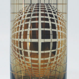 オプチカルアートの先駆者としてあまりにも有名な氏が描いた様なグラフィックのパターンと、升目状のグリッドをアンバーカラーのグラスにゴールドでプリント。