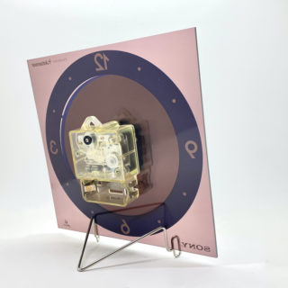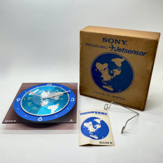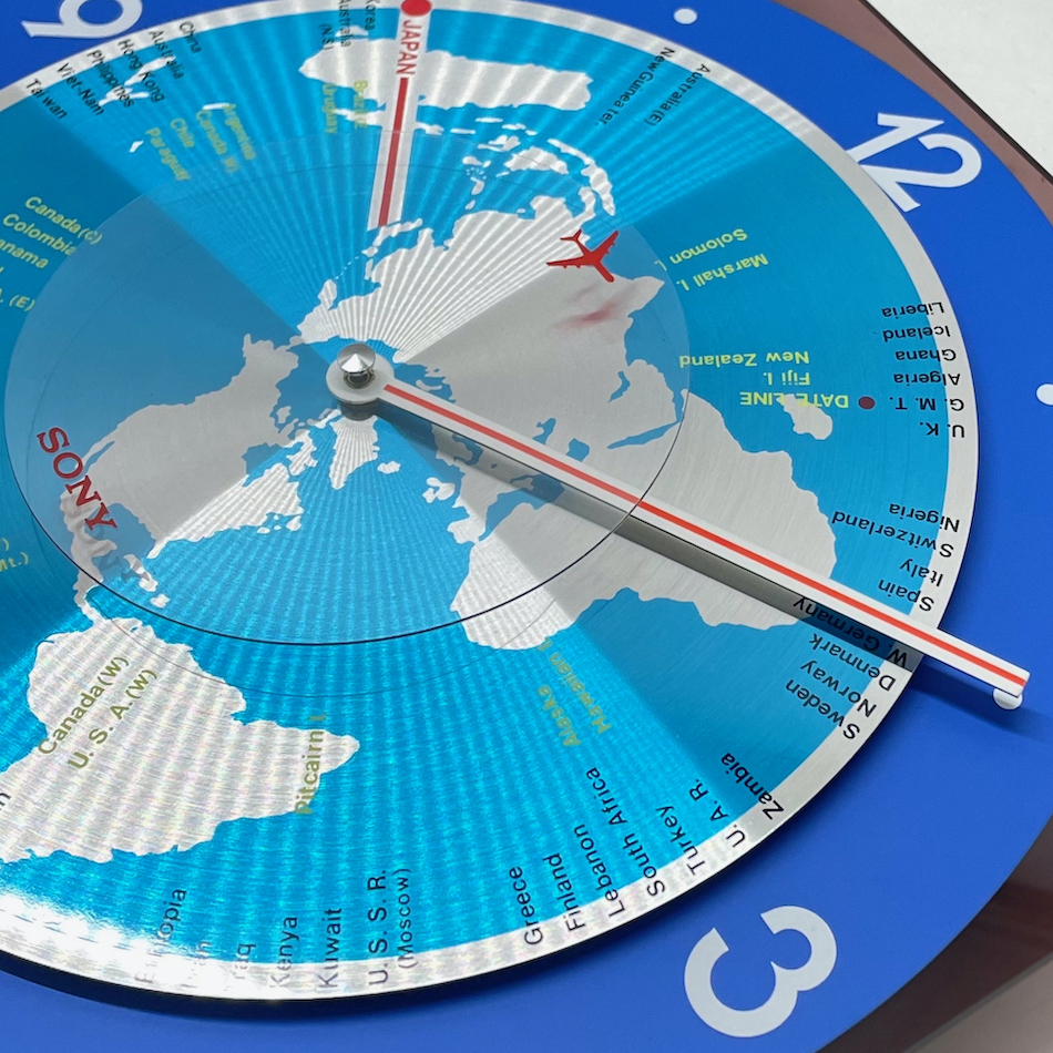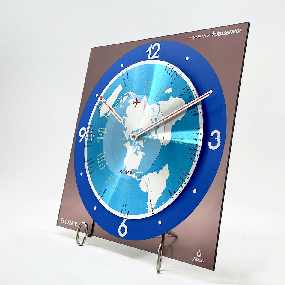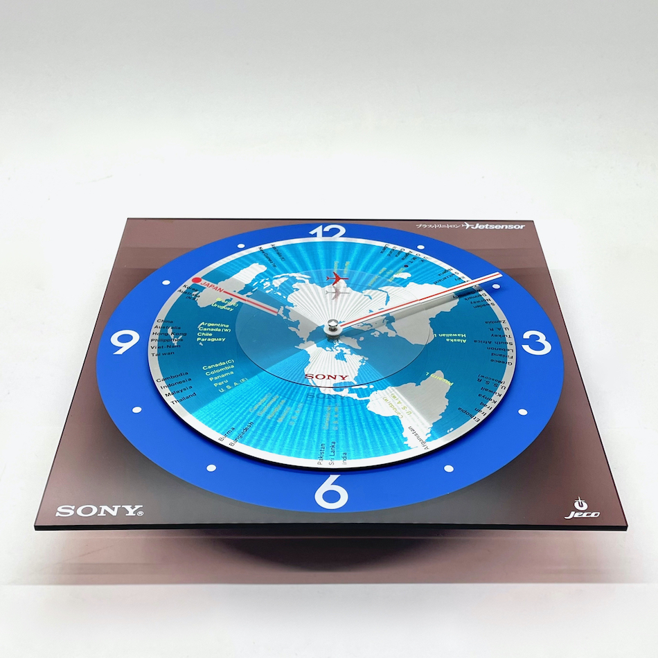 短針として世界地図にがプリントされた円盤の上を、秒針となる透明円盤上の赤いジェット機が周回する、世界に飛躍するSONYをイメージスしたタイリッシュなノベルティ・アイテムです。