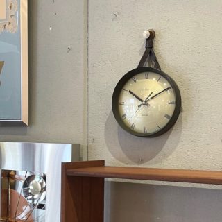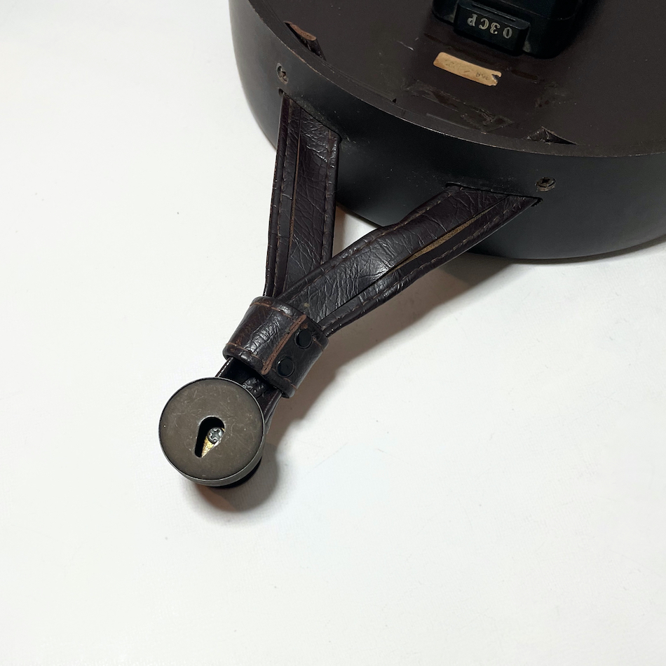 中央からなだらかにラウンドするフェースとガラス風防の立体的なディテール、そして時計を吊り下げるレザー(フェイク)のベルトと丸い金具が効果的なアクセントとなったジェントルな印象のジャーマンデザインです。