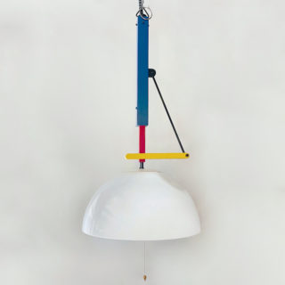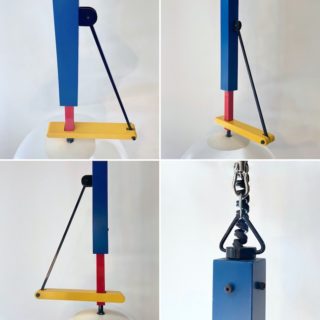 ポストモダンの影響が窺える前衛的/挑発的なカラーリングに、テーブルランプ、フロアランプと同様の日本古来の「自在鉤(じざいかぎ)」の意匠を用いた独自の和洋折衷を具現化。