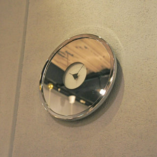 円形ミラーの中央に時計が控えめに配置されたエキセントリックなデザインの80年代日本製ラウンドミラークロック。