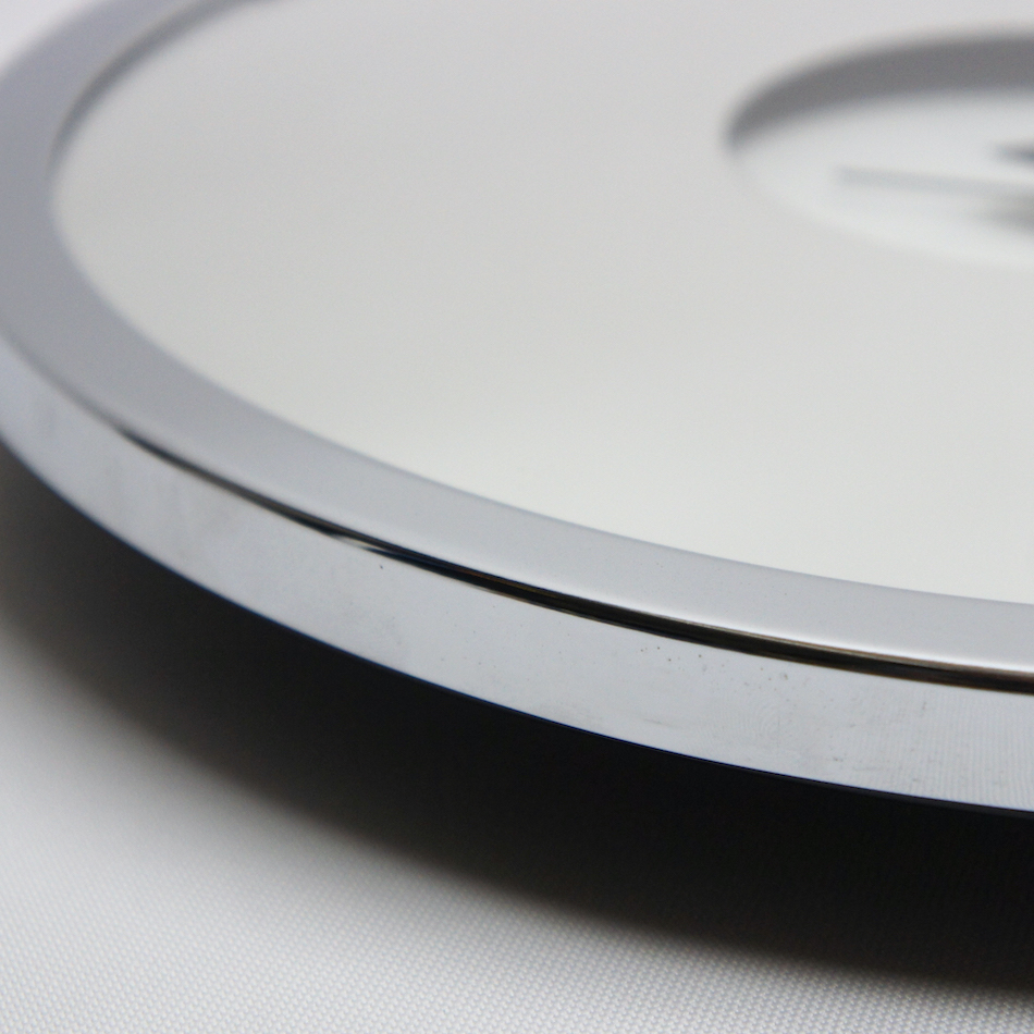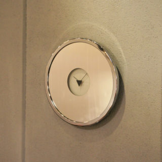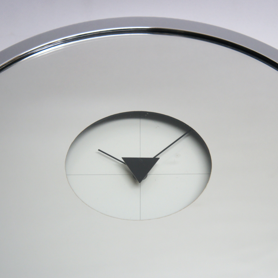 フェイスの大部分を占めるミラー。一切装飾性のないシンプルなデザインによって中央の控えめなスペースで回る三角形の秒針と極めて細い長短針の存在が際立つ、80年代らしいモノトーンでスタイリッシュなプロダクト。