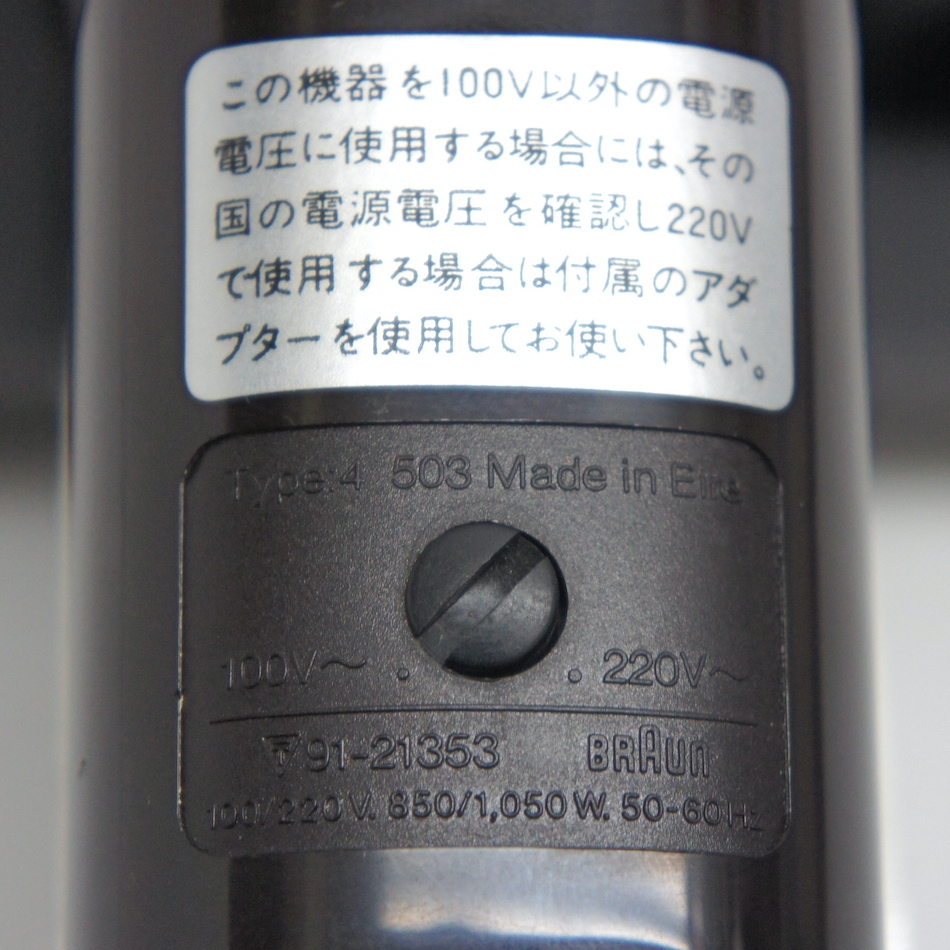 この品は当時、ブラウンジャパンから国内向けに販売されたものですが、ハンドル後部のスイッチで電圧100Vと220Vを切替可能で日本と海外ヨーロッパ圏などの相互使用できるインターナショナルモデル。ミラーのついた携帯ハードケースも付属し、海外コンセント変換プラグとともにスッキリと本体を格納できるスマートなデザイン。