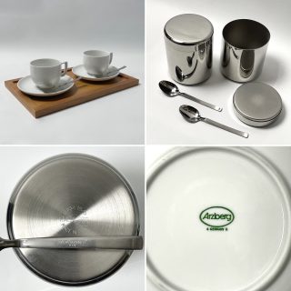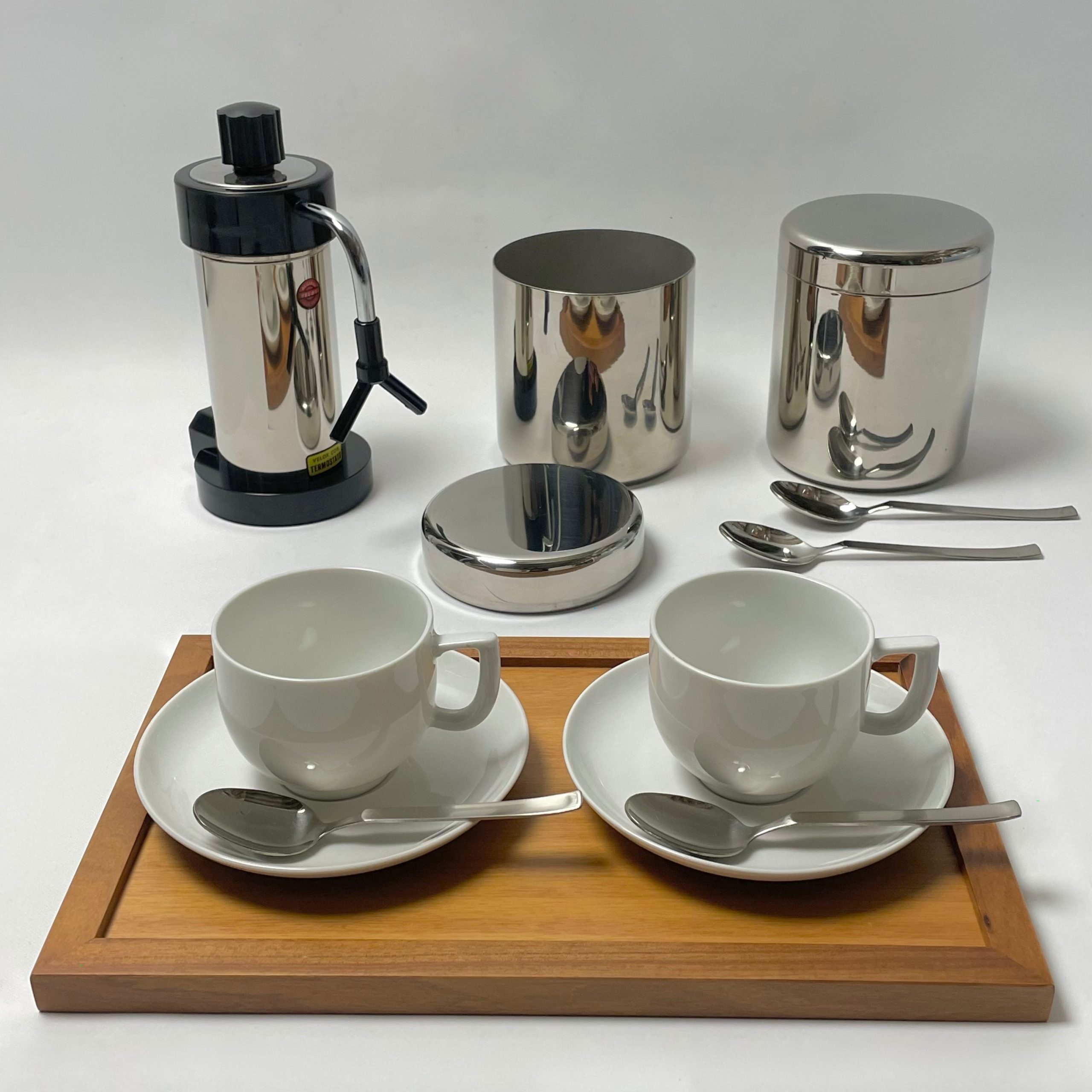 セット構成は、”VELOX”の2カップエスプレッソマシン(電気式)、”ITALWABER”のステンレスキャニスター2個、”ABERT”のスプーンL / S 各2本のイタリアンブランド製品と、ドイツ”Arzberg”のカップ&ソーサー2客に上質な木製トレーも付属。