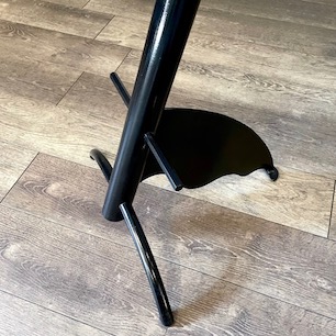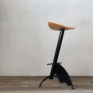 ニョキっと生えた2本の脚と後方のウェーブ状のプレートによって傾斜を持たせた円柱シャフトのレッグフレーム、その上に大きな弧を描いたビーチプライウッドの座面を載せたユニークな80’s イタリアンデザイン。そのルックスは、どこか有機的な生命体のようにも見える独特の個性を発しています。