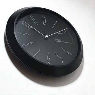ブラックのダイアルに極細のホワイトの指針、インデックスには個性的なオリジナルフォントのアラビア数字を1~12まで並べたジャパニーズ80sデザイン。