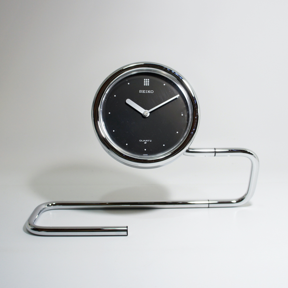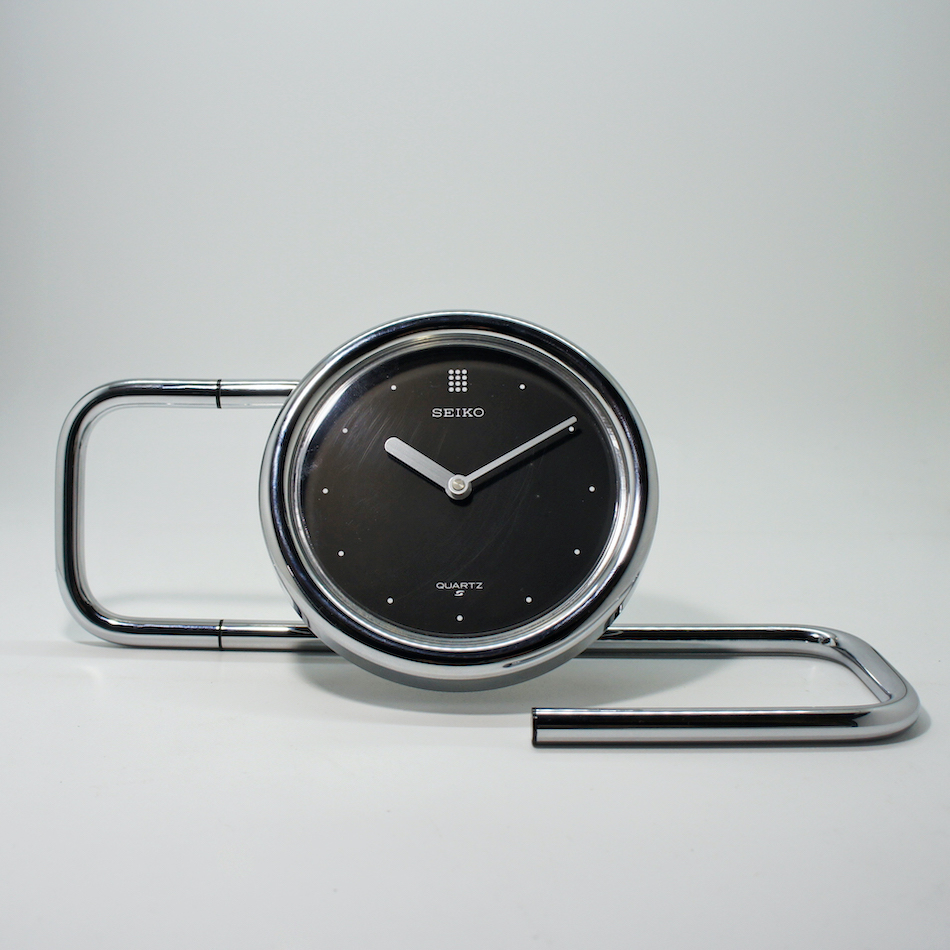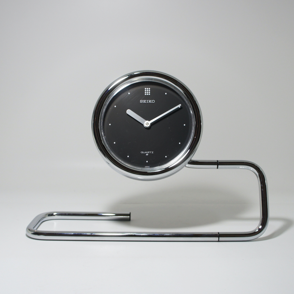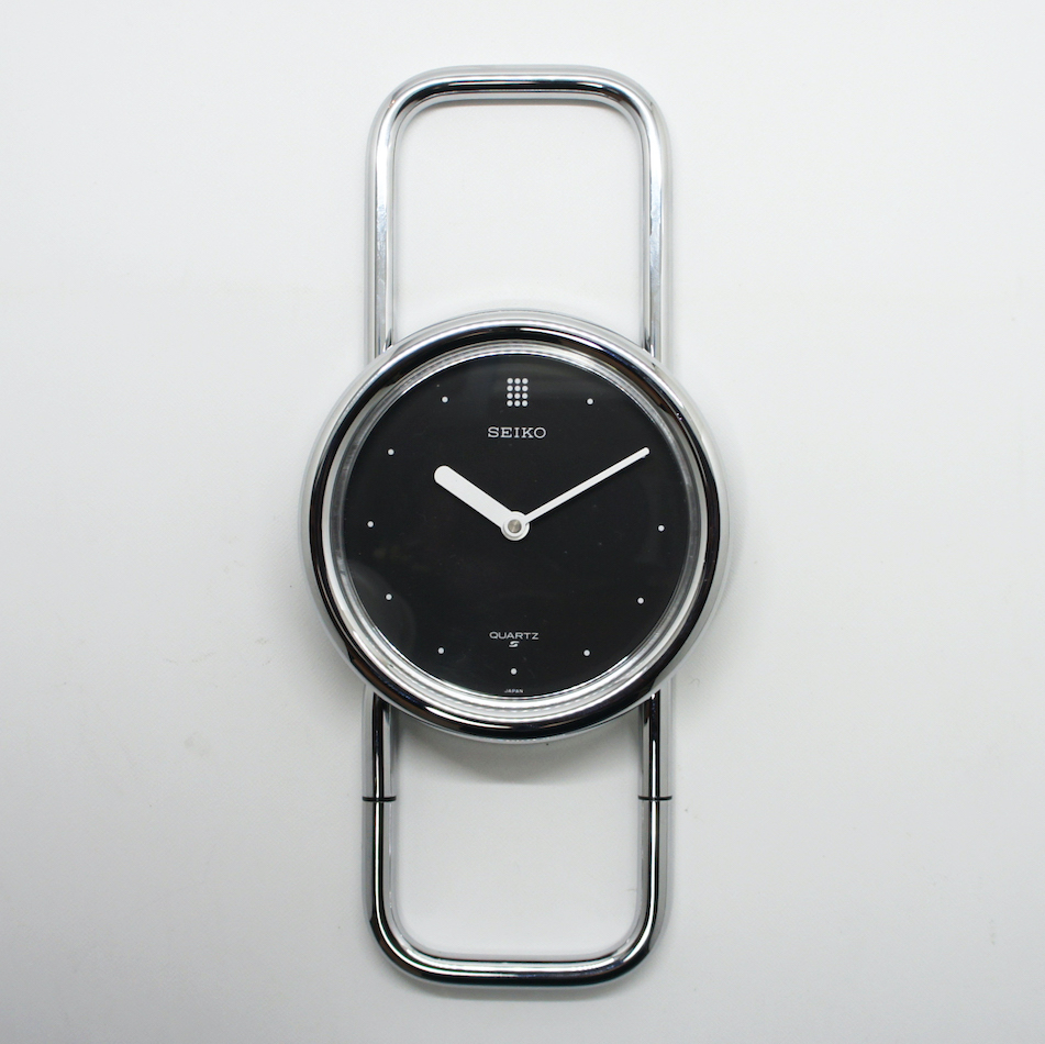シャープなメタリックカラーにインデックスはブラックにホワイトドットのシンプルなグラフィック。アイデア溢れるユニークな機構とトータルデザインをうまく調和させた”SEIKO”の傑作時計ではないでしょうか。