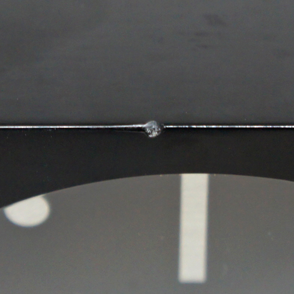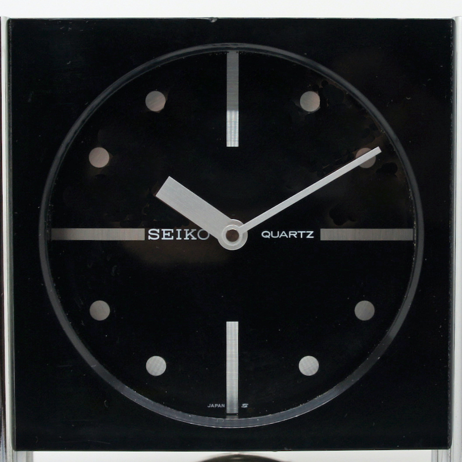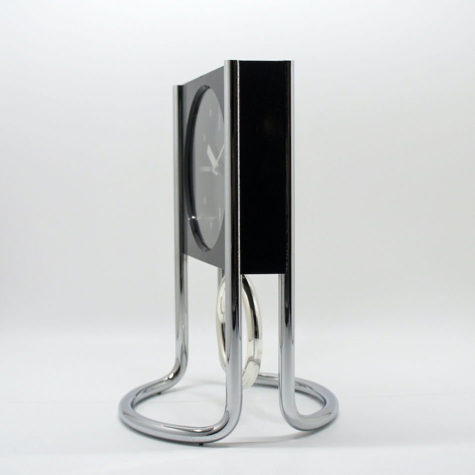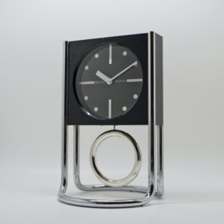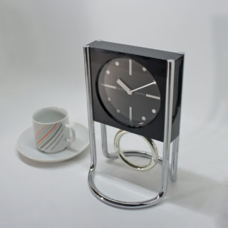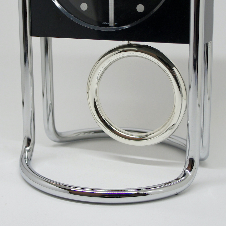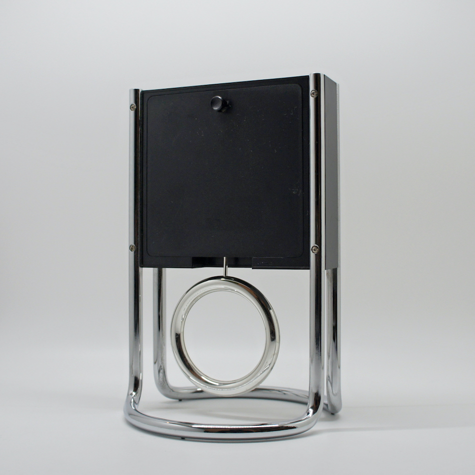ブラック&クロームの80年代的なシャープなカラー、インデックスや時分針もクロームパーツを使用したシンプルなフェイスのグラフィック。本体下部に配したメタルリングの大きな振り子とラウンドフォルムのスタンドフレームがデザインのキーとなり、トータルデザインをスタイリッシュにまとめあげています。