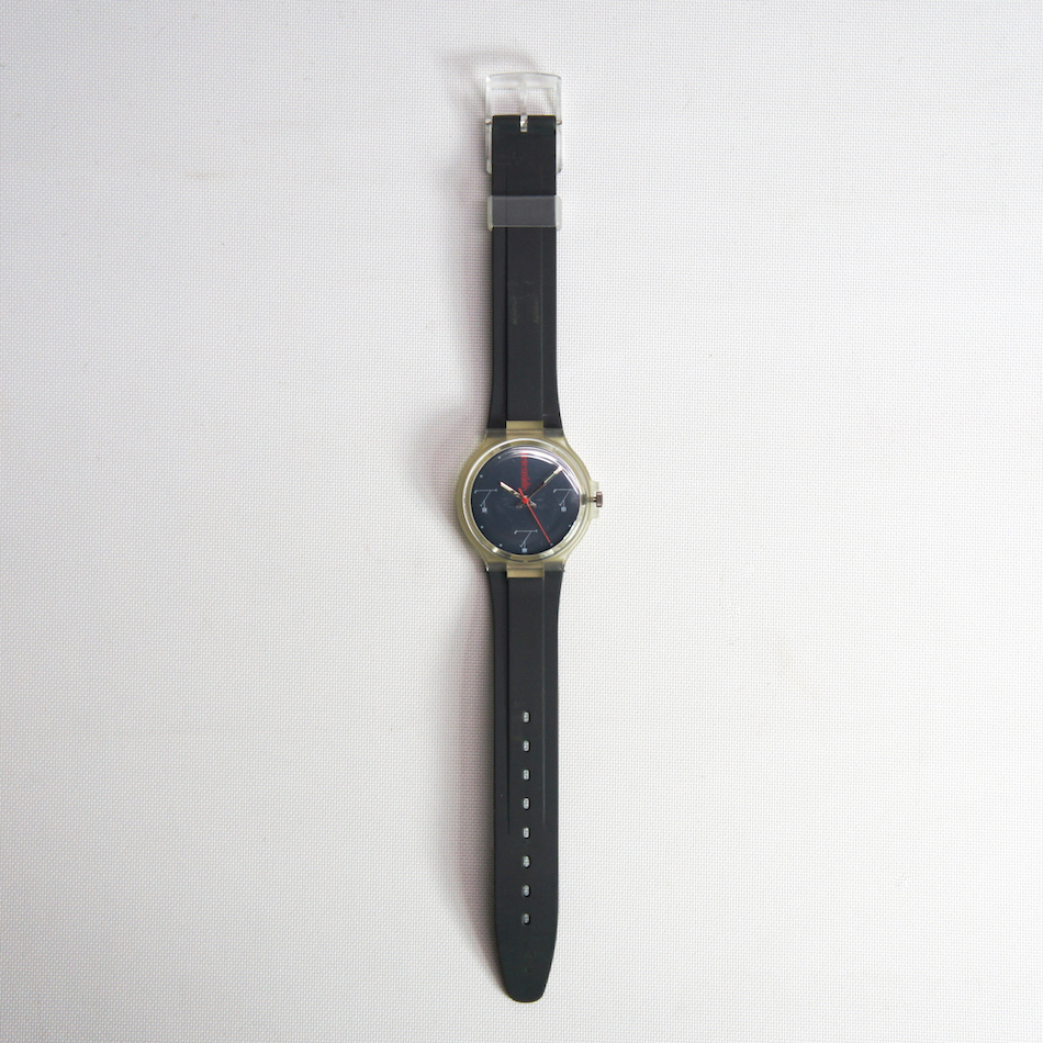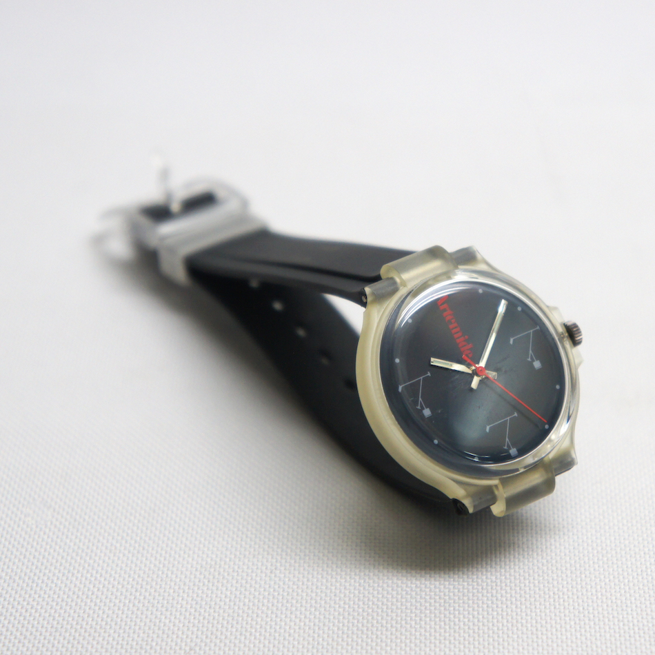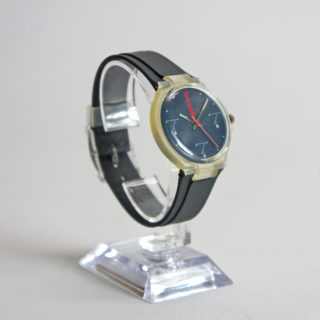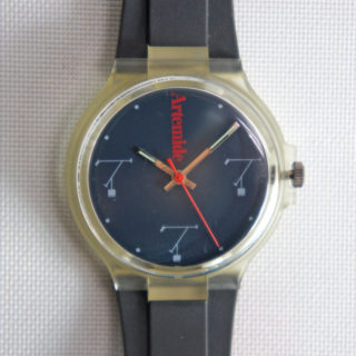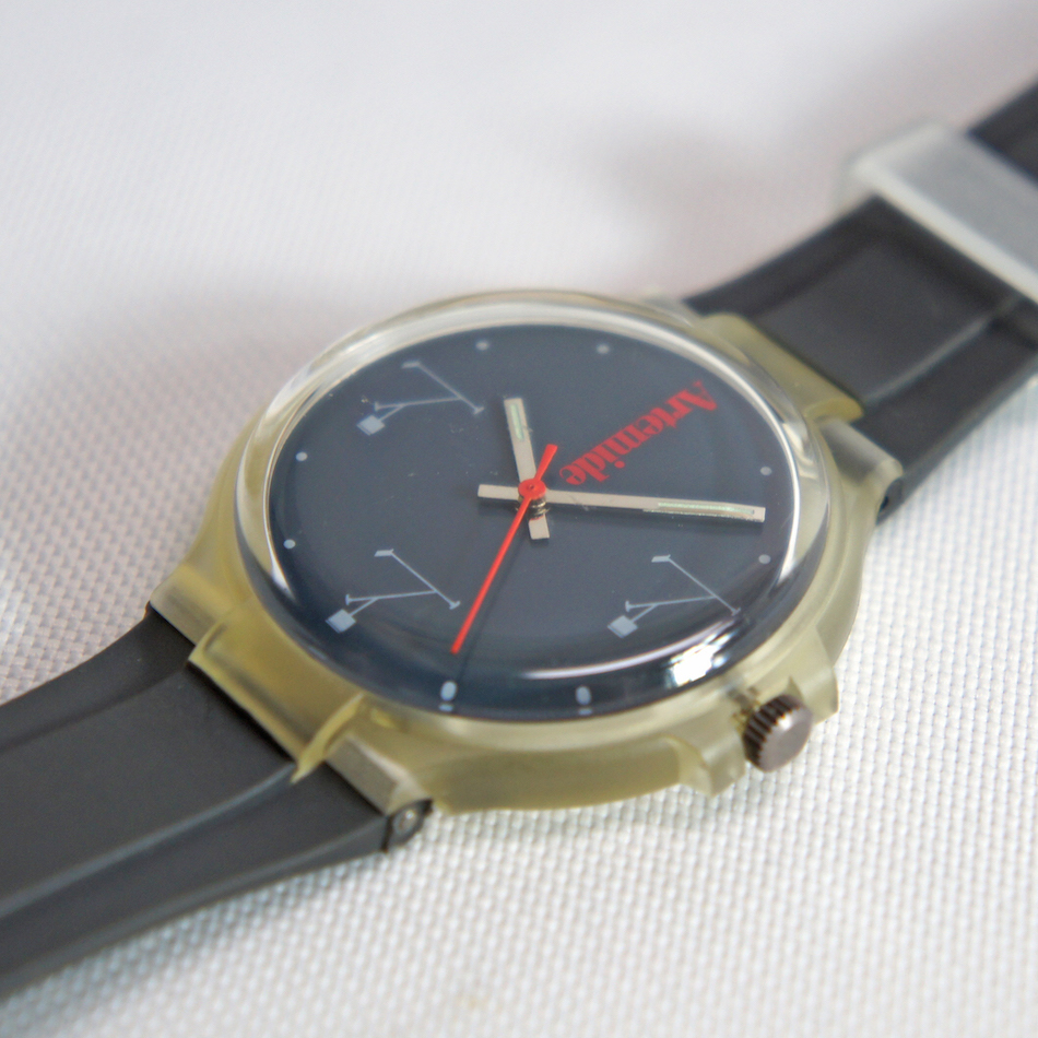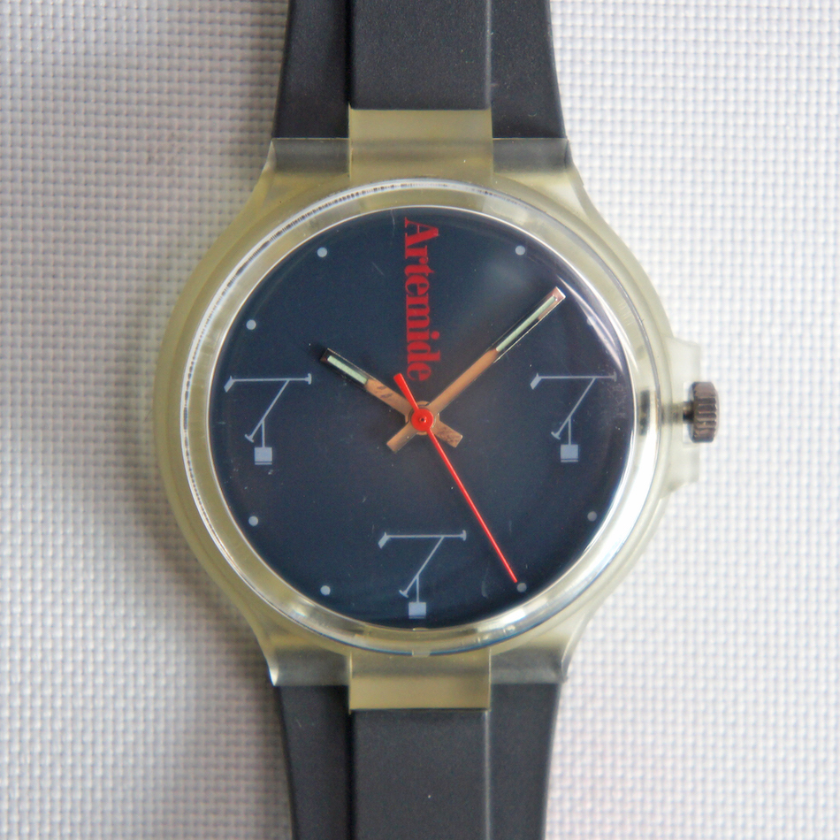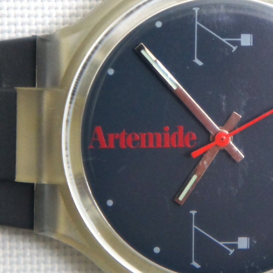 スケルトンのケース、ネイビーのダイアルに赤い秒針とArtemideのロゴが映えるスタイリッシュなデザイン。詳細は不明で高級時計でもありません。オシャレかつマニアックな解る人にだけウケるニッチなウォッチ!気軽に身に纏って手首で輝く小さな”ティチオ”。こんなのが Graphio/buro-stil の大好物です。
