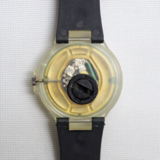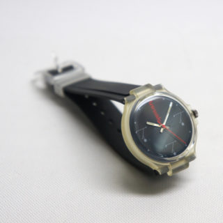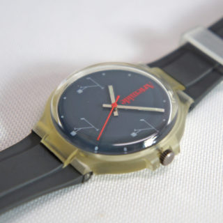 1972年の発売以来、アルテミデを代表する名作照明 “TIZIO / ティチオ”。コンパッソドーロも受賞したその印象的なサイドシルエットが3、6、9のインデックスに描かれたユニークな販促用と思われるリストウォッチ。
