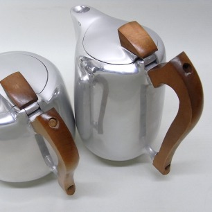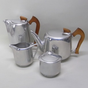 1952年~1962年にかけてラインナップが順次発表されたイギリスPicquot Ware社のマグナリウム製ティーセット。ピコ―ウェアが誕生したのは1938年。シンプル且つ木を使った温かみのあるデザインが特徴です。アルミにマグネシウムを加えることで、銀のような輝きを持ちながら曇りにくい製品を実現させました。今回の4点は全て未使用のデッドストックというのも貴重です。
