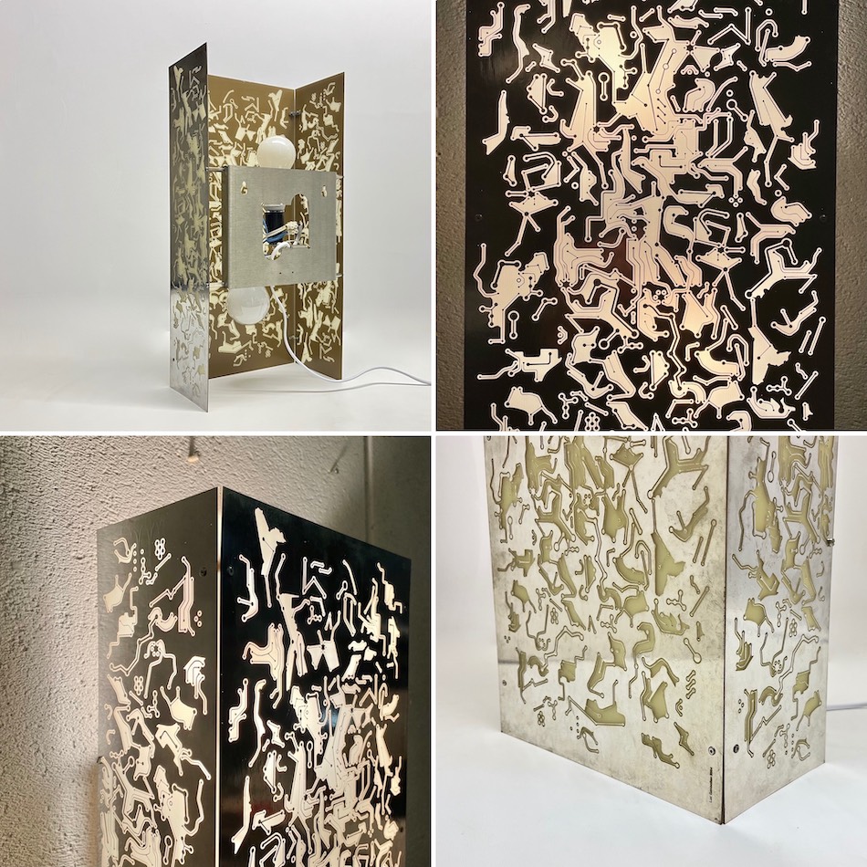 本アイテムは照明の為にプリント基板をオリジナルデザインでを制作。抽象的な基板のグラフィック図案を透過した光が未来的デジタル空間を想起させるユニークな照明です。