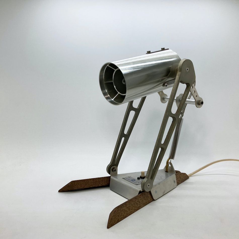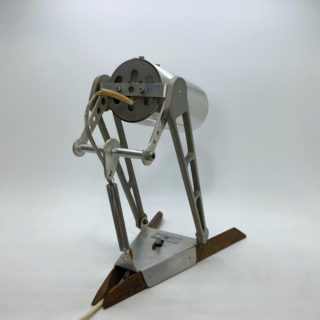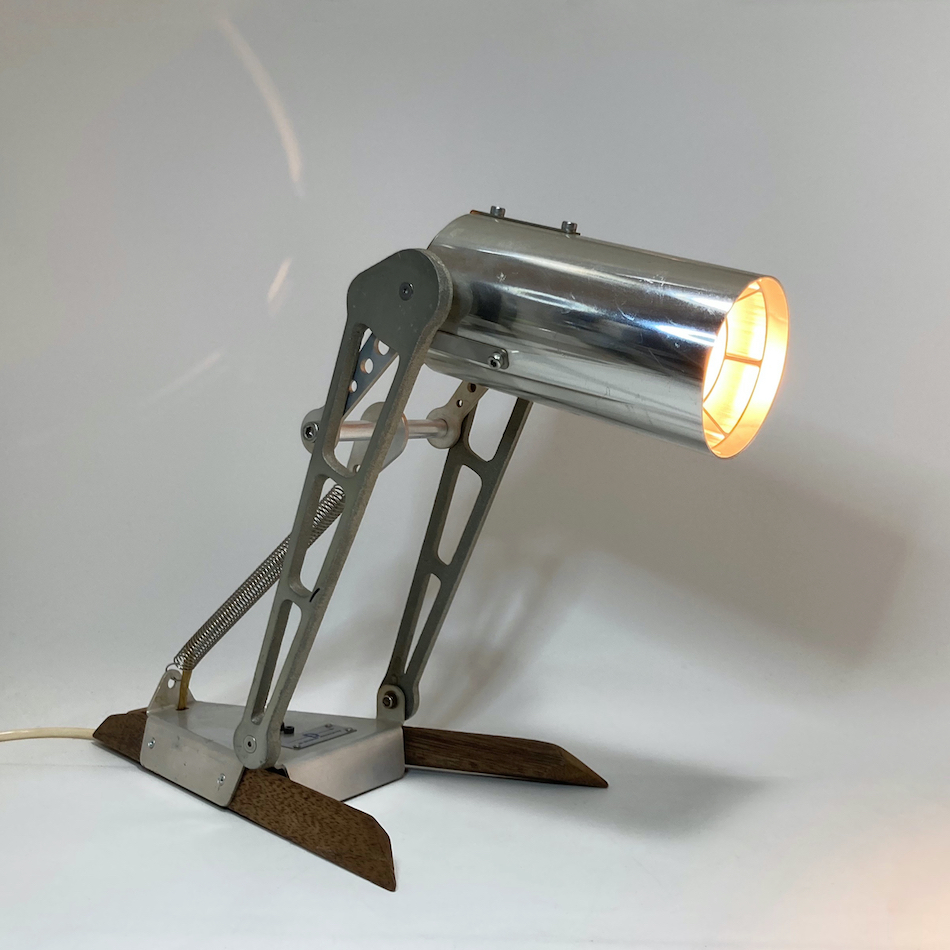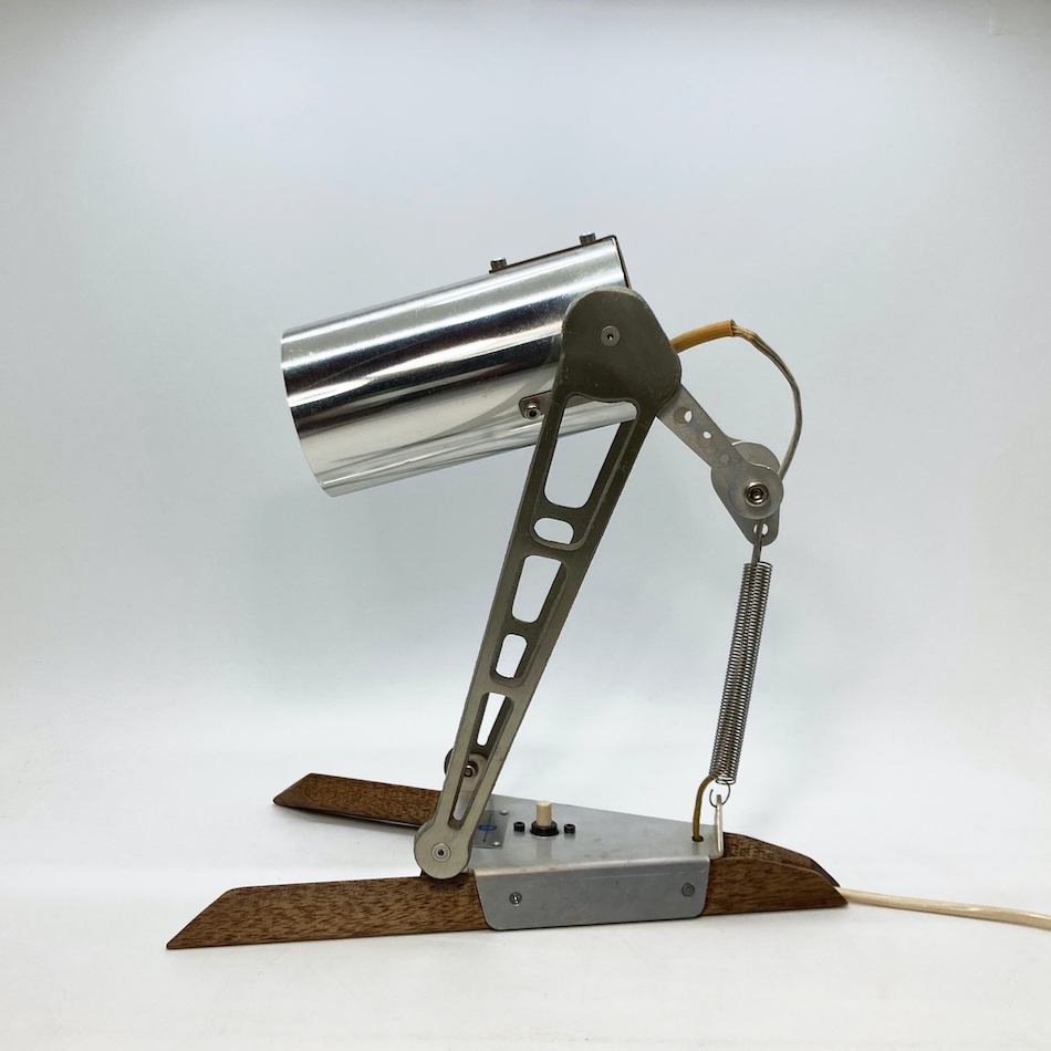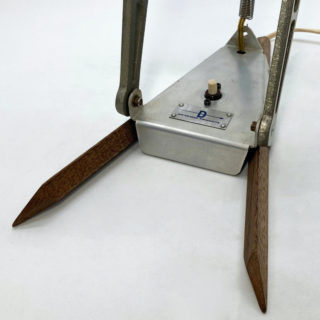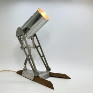 先ずは、ベース部にラワン材を多面カット加工したシャープなステー2本を取り付け、ベースとクランプをメタルスプリングで繋ぎ配線を内蔵、ベース中央にプッシュ式のスイッチを追加、電球は既存のハロゲン球からに40W相当のLEDビーム球に変更。