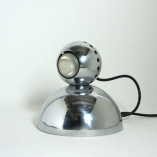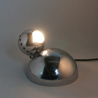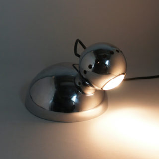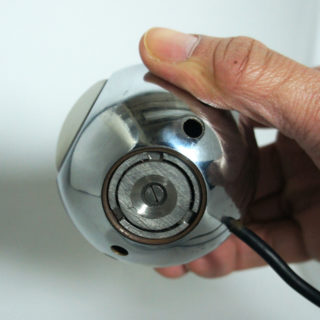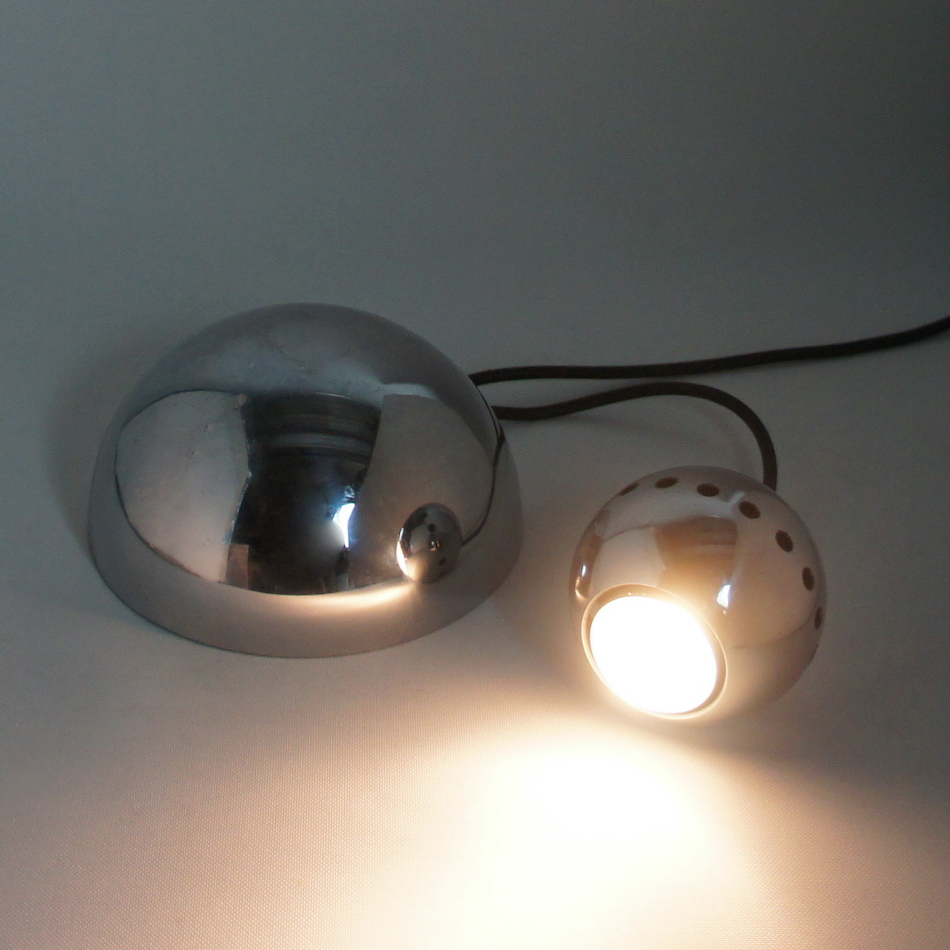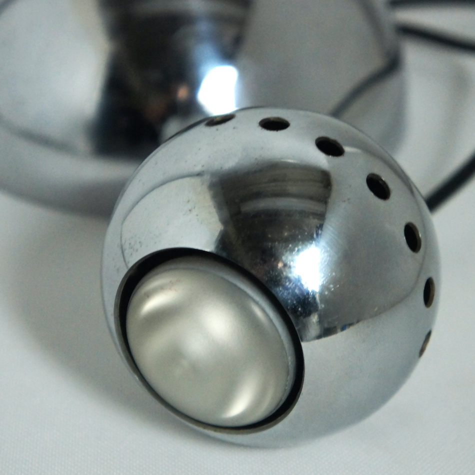 クロームメタル製のボール型シェードが、同じくクロームメタル製の半球の台座の上にマグネットの磁力で引っ付くユニークな構造。シェードは台座のどの部分にも装着でき、位置、角度を自由に変えることができます。